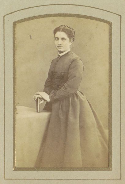 Curator: This gelatin-silver print, dating from around 1863 to 1869, captures a seated woman. The photograph, titled "Portret van een zittende vrouw in een blouse en een rok," is attributed to Willem Matla. Editor: It’s immediately striking how much visual weight the dark clothing and almost defiant gaze carries in this composition, despite the softened focus of the medium. There's something undeniably present about this woman. Curator: I find that particularly interesting, given the socio-cultural context. During this era, portraiture, particularly photographic portraiture, was about constructing a specific, idealized representation, so it is significant to consider the clothing. The dark jacket, offset by the bright blouse collar, can speak volumes, reflecting the restrained aesthetic codes of the era, and the societal expectations that the subject must meet. Editor: Exactly! The composition emphasizes these oppositions. The texture of her skirt provides a softer, rounded base against the defined edges of her torso, while her direct gaze stands in stark contrast to the conventional demure pose expected of women. The artist uses the tools available—pose, lighting, even clothing—to build a multi-layered visual story. I am very interested in the wicker chair armrest. What would this symbolize in such a picture? Curator: The wicker could represent a symbolic association with domesticity, reflecting the woman’s role in the household, but even that appears almost more utilitarian than decorative here. We need to ask, what is being consciously performed in this image? This all works toward understanding who this woman might have been in the context of her place in the world. Editor: A lasting visual document from an intriguing intersection of art, persona, and medium. It presents a wonderful set of semiotic cues to interpret. Curator: It provides a way of glimpsing the identity and cultural symbolism, if only fragmentarily, of the subject in that space and time.