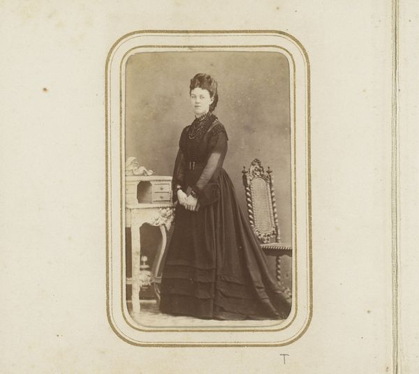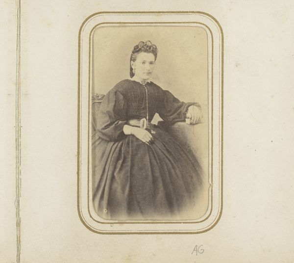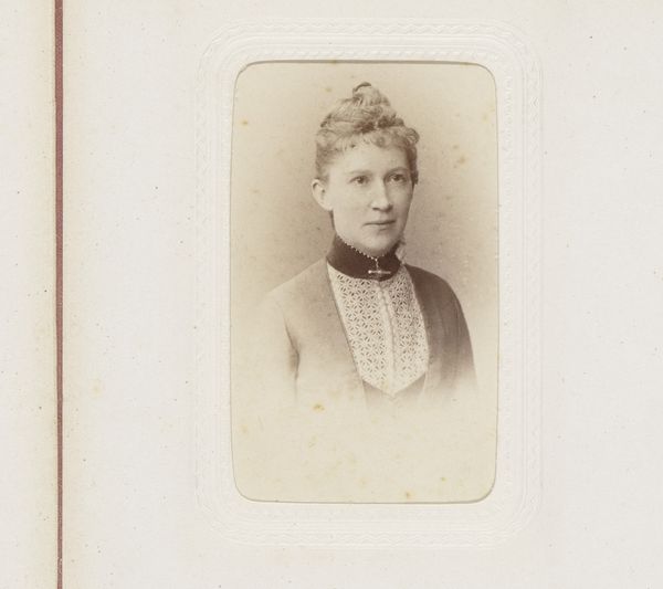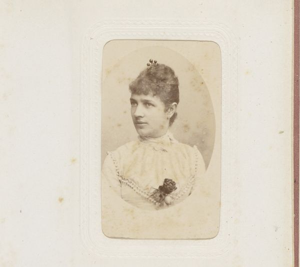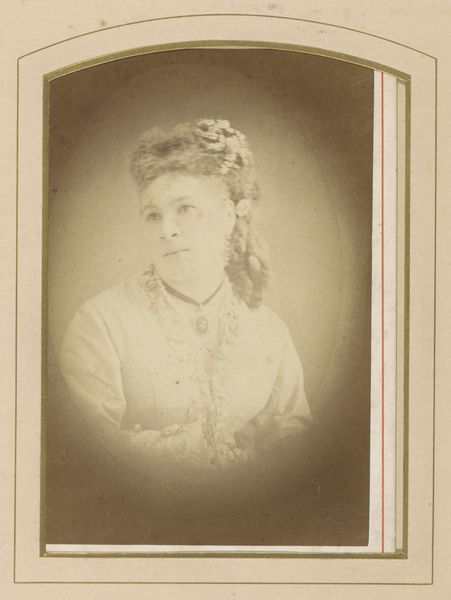 Editor: Here we have a gelatin-silver print titled "Portrait of a Woman with Necklace with Cross," dating from 1875 to 1899 by Jean Baptiste Feilner. I find it intriguing how the oval shape isolates her, almost like a cameo. What stands out to you in this image? Curator: Note the interplay of geometric forms, specifically the relationship between the contained oval and the framing rectangle. This creates a tension, a dialogue between interiority and exteriority that’s visually compelling. Then there's the delicate gradation of light and shadow achieved through the photographic process. Does this manipulation affect the composition's overall impact? Editor: I see what you mean. The sharp focus on her face, compared to the softer rendering of her dress, really draws attention to her expression. What does that say? Curator: It indicates a hierarchy within the composition itself. The artist prioritizes the face as the locus of meaning. The rest becomes textural, adding to the work's aesthetic appeal through pattern and tone rather than definable representation. Semiotically, the face becomes a signifier, while the rest of the composition, quite purposefully, recedes. Editor: So, you're saying the artist is intentionally guiding our reading of the image through these formal choices? Curator: Precisely. It is through the strategic arrangement of line, tone, and texture that we construct meaning. In essence, the material and its composition *are* the message. Editor: That gives me a totally different perspective on how to approach portraits of this time. Curator: Indeed, form and structure, closely examined, will reveal much more than initially apparent.