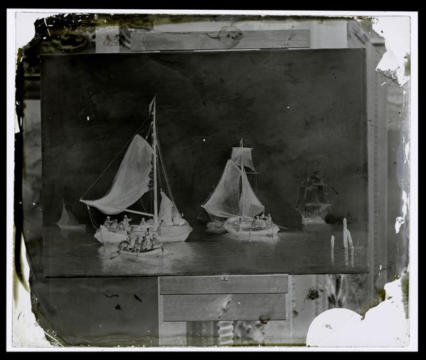 Editor: This is a photographic reproduction, sometime between 1865 and 1900, of a painting of two sailboats at sea, credited to Laurens Lodewijk Kleijn. What strikes me is how the image itself seems to be disintegrating. What do you make of that decay? Curator: Isn't it delicious? This collotype print, nestled within what appears to be a larger photographic collage, feels almost like a captured memory, one that’s fading. It evokes a feeling of transience, of beauty tinged with melancholic awareness of time’s relentless flow. The artist is showing us what photography does: holding on and letting go. How else could you look at a photo? Editor: So, it's not just a faded image, but an intentional statement? Curator: Precisely. Kleijn isn’t merely documenting; he’s layering realities. Think of the late 19th century—photography was still quite novel, fighting for recognition as an art form. He might be suggesting a dialogue between mediums, with photography both preserving and commenting on painting. The framing imagery around the sailboat painting seems to offer context. The question is: what sort? Do you get a sense? Editor: The layered images around it look like the architecture of picture frames; maybe they are samples or design ideas for display? And the blurry figure to the right? Are these remnants and offcuts of art production? The picture becomes its own meta-commentary. Curator: Spot on! It transforms from a seascape into a visual essay about art itself. That sailboat scene, by itself, romantic as can be. But reframed as such? Kleijn asks what it means to view, to create, to remember. Editor: Wow, I saw a fading seascape, but now I see a statement about art and memory. Thanks! Curator: The best art makes us re-see, doesn’t it? My pleasure.