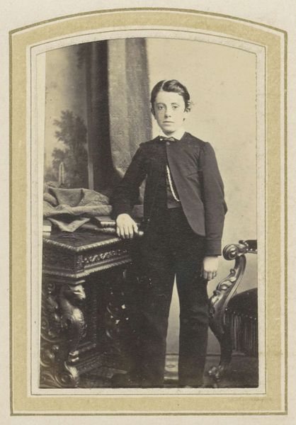 Curator: Here we have "Portrait of a Standing Man with a Top Hat," a photograph by Herbert van Houwelingen, dating roughly from 1865 to 1886. It's an albumen print. Editor: Hmm, a slightly melancholic air, wouldn't you say? Like a muted memory. The sepia tones certainly contribute to that, and the gent’s posture is formal, almost rigid, yet there is a touch of sadness to it all. Curator: Absolutely. I think what’s fascinating is the composition itself. The photographer uses props—a decorative table with the top hat resting on it, and an ornate chair. These aren't just decorative; they are there to elevate the sitter's status, aren’t they? Establishing social position and character. Editor: Indeed, look at the semiotics at play! The hat, that perfectly impractical table, the jacket – each element is chosen to convey particular meanings. And notice the light—soft and diffused. There’s nothing to ruffle our gent, every object feels designed to frame and project prosperity, like theatre staging his character and circumstance. Curator: But also, the gentleness hints at vulnerability behind the image of societal rank. Perhaps he's yearning to share a personal moment that historical portraiture would otherwise eclipse. It would have been a somewhat rare, certainly precious item to create and own in the latter half of the 19th century. It has weight that echoes through time. Editor: And even though it is a staged presentation of prosperity and identity, I still think it's successful at portraying that individual. His stance, leaning almost tentatively towards that imposing piece of furniture, gives off a human sensibility and subtle narrative. You can sense that even the finery and constructed background have an emotional depth that still speaks to us today. Curator: Agreed, a touching study of a life lived; even through the formality we find something unexpectedly real. Editor: A slice of the past that leaves a surprisingly sweet aftertaste.