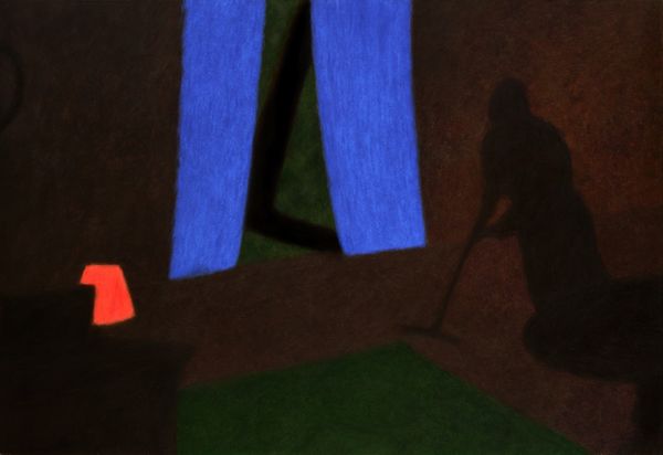 Curator: Looking at Zaniewski's painting, “Living room with a Piano,” what strikes me most is this pervading sense of, I don't know, quiet expectancy? Editor: Quiet expectancy? It looks like a room waiting to be filled with people, with sound. Like the moment before the music starts. I find it slightly melancholic. It makes me think about those late evenings just before you switch off all of the lights and head to bed. The warmth from the lamp, the shadows lengthening… It's rather intimate, isn't it? Curator: Intimate, yes. These ruddy browns and yellows make me consider domesticity. What's interesting here is the tension between the everyday scene and the techniques. Zaniewski has clearly put much impasto and acrylic onto the painting. It creates a textured surface that demands attention. How might we think of the rise in popularity of musical salons and parlors in the 19th Century given these spaces allowed new interactions between class and gender? Editor: Salons of the time… the painting style pushes me towards a very raw emotional space, quite separate from formal social gatherings. This neo-expressionist leaning feels almost like a diary entry, a fragmented memory. I feel it even in that blue rectangle indicating a window—it almost cuts across the warmth of the space. Do you feel the window adds another perspective in an intimate painting of interiors? Curator: It does add another perspective. But given this neo-expressionist lens that you introduced, could it suggest freedom, perhaps a space for alternative perspectives and the chance of new critical discourse at the end of the 20th century? Editor: That tension of freedom from domestic space really resonates, especially thinking of the stark geometry. Curator: And that, perhaps, brings a critical edge to the otherwise quiet interior, one in which even the piano seems to wait, quietly. Editor: Waiting... Yes, waiting for the story to unfold. Makes me feel nostalgic, thinking about how our domestic spaces hold and reflect who we are and how we act. Curator: And how art helps us see that reflected story more clearly. Editor: Absolutely. It’s the resonance in the details.