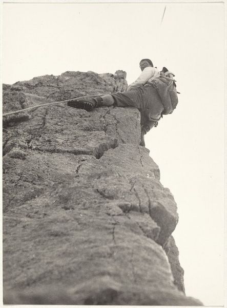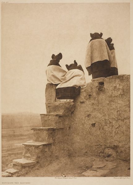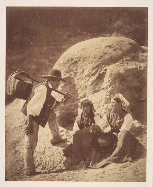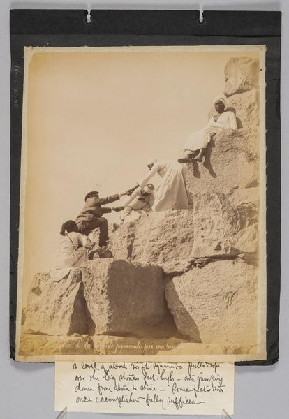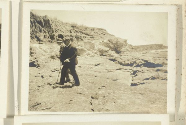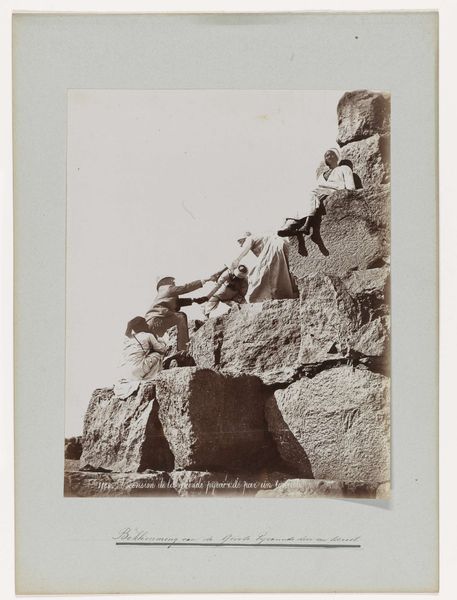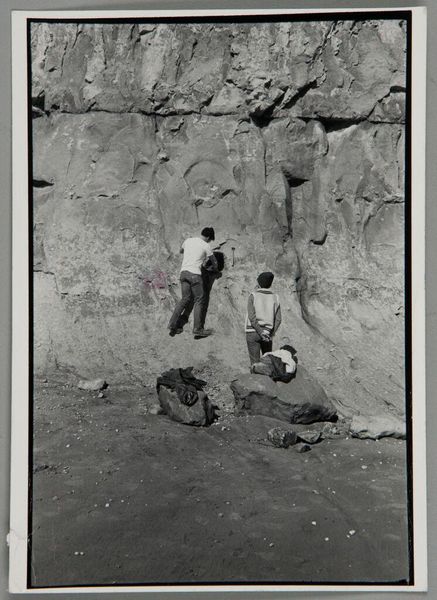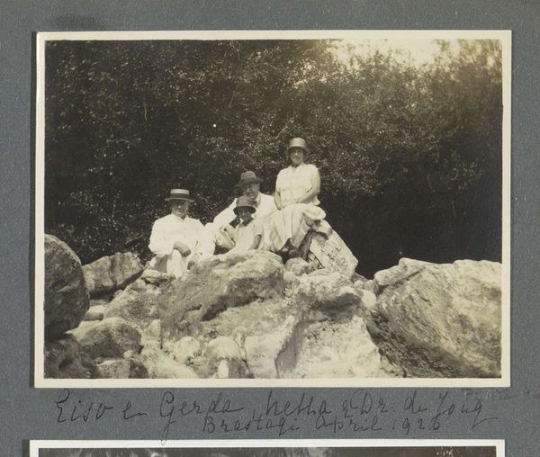 Curator: This photograph, attributed to A.G.A. van Eelde and dating probably from 1925-1927, is titled "De heren Bierens de Haan zittend onder een steile rots"—"The Messrs. Bierens de Haan sitting under a steep rock." Editor: My initial impression is… stillness. It's almost geological in its quietude. The stark monochrome adds to that feeling. Two figures, almost dwarfed, but definitely… there. A really strange portrait. Curator: Indeed. The two figures, presumably the Bierens de Haan brothers, are positioned in stark contrast to the immensity of the rock face. The photograph itself is a gelatin silver print, and that medium gives it this incredible tonal range. The monochrome reinforces a sense of timelessness. It almost invites reflection on scale – the ephemeral nature of human existence against the enduring presence of landscape. Editor: You’re right, the rock is absolutely ancient, while they are caught, pinned almost like butterflies, even though they’re living. They almost become part of the rock face themselves. There’s such a loneliness to it too, a vastness that's strangely intimate at the same time. Curator: There’s also the contrast in their clothing; they're formally dressed in light-colored garments which sharply distinguishes them from the darkness of the rock behind them. I’m drawn to this because in Western art the symbolism of light traditionally represents divinity and truth while darkness often corresponds to evil, the underworld and shadows, implying a sense of the human struggle against a greater unknown. What is knowledge? Where does it come from? How long does it last? It seems like it is questioning what their existence actually is against nature's eternity. Editor: Wow, yeah! A dialogue across deep time… it’s less a portrait and more like a stage. This austere environment somehow amplifies a feeling of contemplation. It pushes the two figures into themselves. There’s something almost existential about this tableau… a raw and honest feel! Curator: Perhaps van Eelde was making a statement on the transient nature of human ambition in contrast with the unwavering consistency of nature, capturing a subtle narrative of existential placement and scale. Editor: And it all starts with that single shared moment captured in a time that stretches from then to, well, right now. Just incredible.