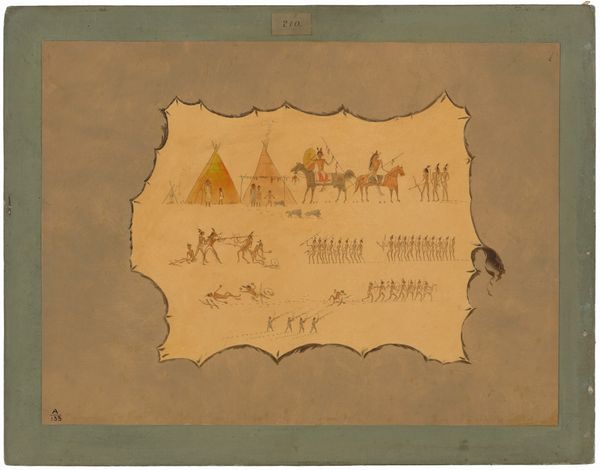 Curator: Here we have "Four Rows of Musicians and Dancers," an ink drawing printed by Rudolph Ackermann of London in 1817. What springs to mind when you see it? Editor: Oh, this looks like somebody's super intricate doodle, like a hyperactive frieze depicting some long-lost society wedding! Curator: Intriguing. Let’s unpack that a bit. Ackermann, publishing this print in the Romantic era, captured a theme central to that time: genre painting, depicting scenes of everyday life. The four rows teem with dancing figures and musicians, revealing a hierarchy, perhaps even societal stratification. The print serves as a memory, an echo of revelry now past. Editor: That makes sense. I can almost hear the slightly off-key orchestra and smell the spilled champagne. But there's a starkness, a shadow play aspect to these silhouettes, which casts an oddly solemn atmosphere. Like joy captured and pinned, slightly lifeless. Curator: The silhouette as a medium does possess a fascinating duality. It preserves form yet obscures individuality, acting as both memento and abstraction. It’s an uncanny mirror reflecting, in stark lines, our communal human experience across time. Ackermann's choice is evocative here, don't you agree? Editor: Absolutely! Each row almost acts as a strip of film. See the first row – a guy's practically doing the Charleston, way ahead of his time! It’s a compressed story; romance, merriment... yet distanced, almost ghostlike in their rendering. It does beg the question: is he celebrating life or already mourning its passing? Curator: An insightful interpretation! It makes you think of cultural memory, doesn't it? These weren't specific portraits, but archetypes representing universal actions, reflecting traditions through symbolic depictions preserved on paper. Editor: And those long lost universal actions live on as silhouettes now – like shadows holding echoes. Well, I certainly won’t look at doodles the same way ever again! Curator: Nor will I! I will reflect on what symbols communicate about enduring cultural patterns.