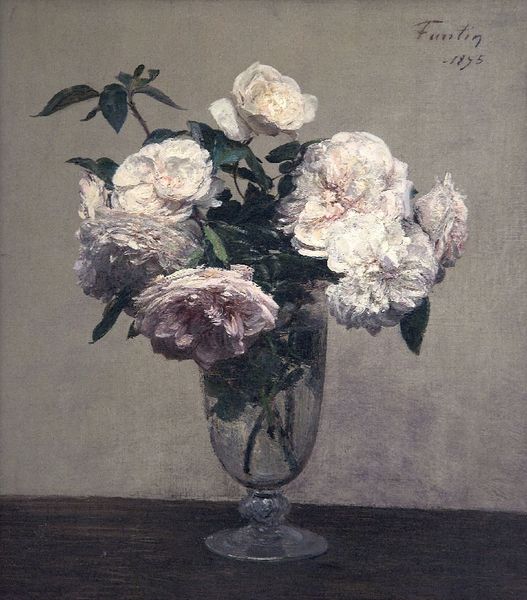 Henri Fantin-Latour captured this oil on canvas painting, entitled 'White Roses'. Here, Fantin-Latour explores the simple, almost mundane, subject of flowers in a glass. The flowers themselves are painted with thick impasto strokes, full of light. The layering of oil paint, with the inherent qualities of viscosity and drying time, allows for a building-up of texture, mimicking the delicate forms of the roses. This physicality of paint application is a key element; each brushstroke represents a deliberate action, a moment of labor. The dark background is made with thin washes, built up and rubbed back, contrasting with the sculptural quality of the flowers themselves. It’s important to note that this painting emerged during a time when the art world was reckoning with industrialization and shifting social structures. Fantin-Latour, in focusing on the handmade and the intimate, offers a quiet, thoughtful observation on the beauty of the natural world, achieved through a clear understanding of his materials.