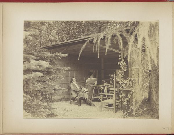 This sepia-toned photograph by Heinrich Ernst & Co captures Chinese contract laborers at their lodging on a tobacco field. The architecture immediately draws the eye—a stilted structure with a layered, thatched roof, its geometric form softened by the organic materials. The composition is structured around contrasts. The ordered, man-made building cuts into the wild, overgrown landscape, a visual metaphor for imposed labor systems. Light and shadow play across the image, defining the textures of the thatched roof and the rough-hewn wooden supports, emphasizing the materiality and construction. The human figures are carefully placed within the architectural framework, their presence a stark reminder of the social and economic structures at play. This photograph uses form to communicate power, labor, and the intersection of culture and exploitation, prompting us to reflect on its historical context and lasting impact.