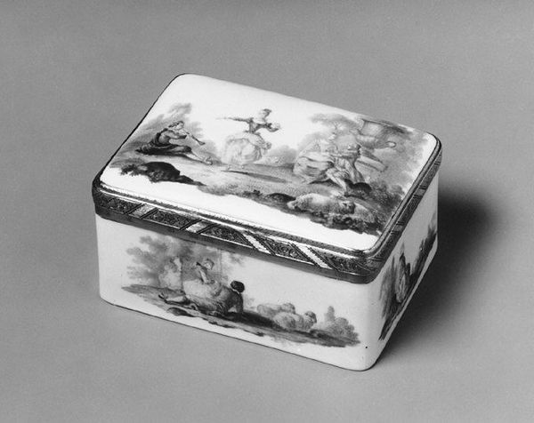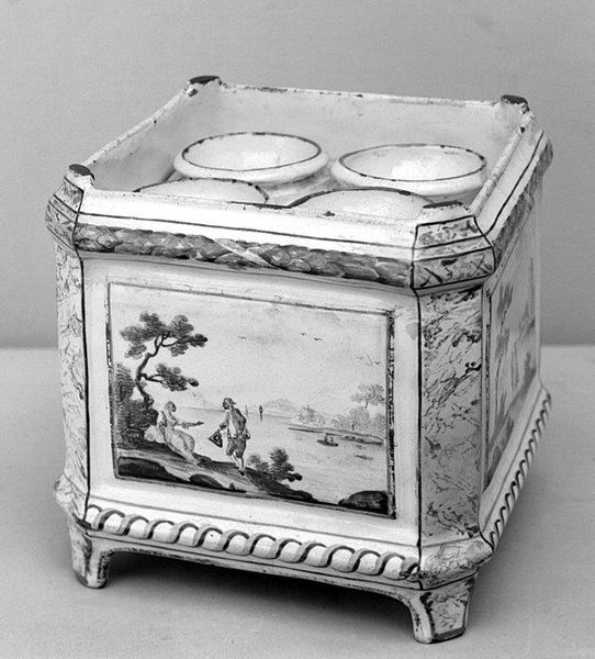 Editor: Standing before us is a porcelain inkwell, dating back to the 1730s or 40s. It's part of an inkstand created by the Meissen Manufactory. The monochromatic painting on the white ceramic surface reminds me of intricate old photographs. I find the nautical scenes particularly striking. What details capture your attention most? Curator: Oh, darling, you've got a good eye. For me, it's the rococo exuberance combined with the disciplined craft of porcelain. It makes me imagine powdered wigs and secret missives sealed with wax. Do you see how the central image of the bustling harbor contrasts with the stillness needed for writing? It's a beautiful tension. The artist had such a masterful control of tiny brushes. Editor: The contrast between a serene writing experience and chaotic harbor is insightful, I had not considered that. What was so special about Meissen porcelain during that period? Curator: Well, Meissen was the first to unlock the secrets of hard-paste porcelain outside of China. The European elite were absolutely obsessed. Owning Meissen was a status symbol. So you've got this almost alchemical creation married with the most frivolous, decorative impulses of the time. Editor: So this wasn't just any writing set. This was making a statement! I will carry that observation into other art I review, what materials suggest about a patron's purpose. Curator: Precisely. Every brushstroke whispers a story, and it's our joy to overhear them, isn't it?