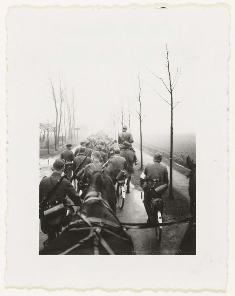 This small, undated photograph, by an anonymous artist, captures Wehrmacht soldiers in a snow-covered forest. It's monochromatic, so you could almost miss the color, or lack of it; but that's part of its power. The surface has a matte quality, and the tones range from soft grays to deep blacks. There's a kind of layering in the composition, with the soldiers in the foreground, the trees creating a middle ground, and then a blurred, almost ghostly background. It reminds me of Gerhard Richter's blurred paintings, where the process is about obscuring as much as it reveals. Look at the way the snow clings to the branches, creating these delicate, almost lace-like patterns. It's a beautiful, stark contrast to the harsh reality of what we know about the soldiers in the image. The photograph reminds me of the work of someone like Luc Tuymans, who also deals with historical trauma through a muted, almost melancholic palette. It’s a reminder that art doesn’t always give answers; sometimes, it just holds a space for us to ask questions.