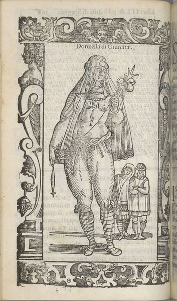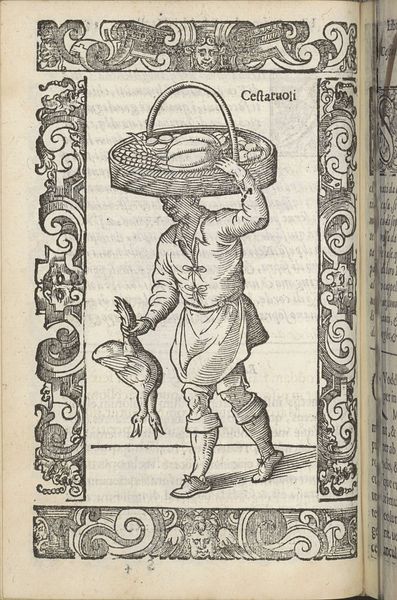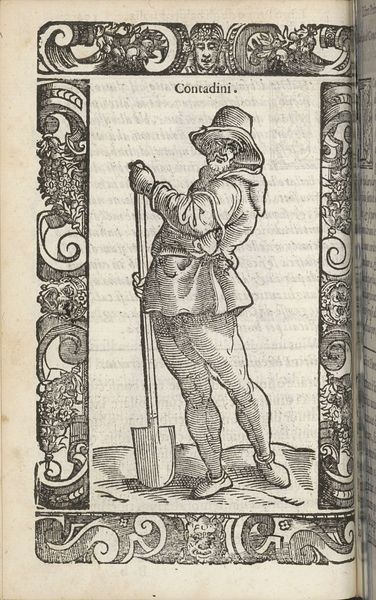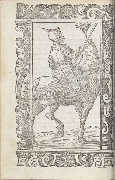 Curator: Good morning. We’re looking at "Cavalieri gothi antichi," an engraving by Christoph Krieger from 1598. It presents a mounted knight in elaborate armor, framed within a decorative border. What are your first thoughts on it? Editor: Stark, powerful. The monochromatic palette creates an intense atmosphere. The linework is quite intricate. But the rigidity, the linearity...there’s something a little unsettling about it. Curator: The strength of line certainly defines the image. Krieger employed a woodcut and engraving technique to meticulously render form and texture. The visual language speaks to the prevailing artistic conventions of the period. Notice how the artist creates depth using simple hatching techniques to convey the texture of the armor, the folds of the fabric, and the undulation of the landscape. Editor: The decorative border also frames a peculiar narrative. Are these figures meant to symbolize nobility? There’s almost a medieval romance feel to this print, contrasting with the socio-political anxieties of its time, perhaps? It feels rather formalized. Curator: Krieger was working in an era grappling with shifts in power. Such prints circulated widely, shaping perceptions of history and identity. Prints such as this could have been designed to promote the existing order. The details of attire and accouterments speak volumes about social position. Editor: Exactly. Think about where it was published and who consumed it. Such imagery served the interests of particular elites. I find myself questioning whose version of history is being presented and validated through such imagery. Curator: An astute point. Examining the materials – woodcut, engraving - also brings up interesting discussions around craft and dissemination in early modern Europe. How did this piece help propagate specific views through its accessibility and the power of repeatable imagery? Editor: Reflecting on the artist’s choices concerning line, form, and texture offers some critical perspective on how prints contributed to creating collective memory and legitimizing specific historical interpretations. Curator: Yes, it’s an intricate image with significant social impact. Editor: Indeed. It challenges us to consider its cultural and historical relevance more thoughtfully.
