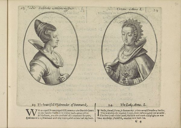 Editor: This print, "Portretten van twee courtisanes," from around 1630 by Crispijn van de Passe the Younger, is quite striking. I’m fascinated by the contrasting depictions, set within circular frames. What stands out to you most in terms of form and composition? Curator: The stark linear quality of the engraving commands attention, doesn't it? Note the artist’s reliance on line to delineate form and texture. Look closely: How does the varying density and direction of the lines create a sense of volume and shadow? It's not about surface realism; instead, it prioritizes graphic clarity. Editor: Yes, the lines are very deliberate. What about the composition itself, placing these two portraits side by side? What effect does that choice achieve? Curator: Precisely. It compels us to read them in relation to each other, despite the very different ways they are positioned. The use of the oval frames against the larger rectangular page creates a tension – a dialogue between containment and expansion. What are your thoughts on the empty spaces and textual elements that accompany the portraits? Do they enhance or detract from the visual impact, in your view? Editor: I see what you mean about the tension. At first, the text was a little distracting. However, the text and ornament of the broader space contrast with the curves and lines of the sitters' images to me, in a way I like. Thank you for pointing out the subtleties. I now notice how everything interacts and complements one another. Curator: A fresh viewing, indeed! It’s in those structural relationships where the essence of the artwork resides.