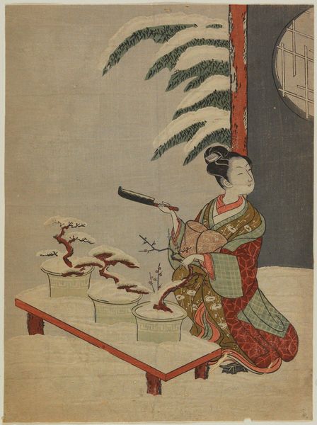 Curator: Suzuki Harunobu, who lived from 1725 to 1770, is the artist behind this print titled "Parody with Young Girl as a Daoist Immortal Handaka Sonja Conjuring a Dragon from a Bowl," currently housed at the Harvard Art Museums. Editor: What strikes me first is the whimsy of it all. A young woman, conjuring a dragon from a bowl? It's a lighthearted take on the mystical. Curator: Indeed, this work exemplifies Harunobu's mastery of the *nishiki-e*, brocade print technique, with its harmonious palette and delicate lines. The composition reflects a refined understanding of negative space. Editor: And the dragon itself—so playful and full of energy, not at all fearsome. It makes me think of childhood imagination. Curator: We can observe the clever juxtaposition of the mundane—a young woman in daily attire—with the fantastical—a dragon emerging from a simple bowl, creating a delightful tension. Editor: It is just a reminder that art can be both beautiful and a little bit cheeky, and it has certainly given me a fresh perspective. Curator: Yes, its enduring appeal lies in its ability to balance technical skill with imaginative storytelling, inviting viewers to appreciate the beauty in the unexpected.
