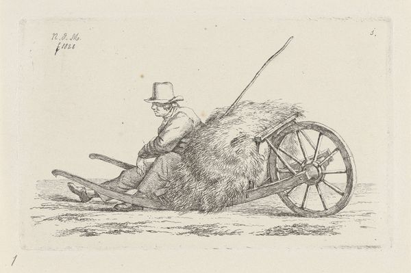 Curator: This satirical pen drawing is called "Spotprent op trage behandeling van zaken in de Tweede Kamer, 1873", which translates to “Cartoon on the slow handling of matters in the Lower House”. It was created in 1873 by Johan Michaël Schmidt Crans. Editor: Oh, immediately the snail beside the worker just pops. Such an obvious but effective symbol. A tangible sense of labor. It's all tightly composed in blacks and whites, evoking exhaustion and futility at the same time, wouldn’t you agree? Curator: I agree about the composition; the penwork is so incredibly detailed. There’s the harried-looking man struggling to push a loaded cart—with “zaken”, or matters, written on the various items. There's even a dog nipping at his heels adding to the chaos! And, of course, the snail. Editor: The dogs! It’s those kinds of recurring canine depictions throughout art history that really spark interest. What are they guarding? The slow and careful advancement of bureaucracy? They really give depth to the man’s plight, which might read another way if they were gone. Curator: Interesting thought. Considering its context, the drawing served as commentary on the Dutch Parliament's pace in addressing legislative matters at the time. You see, it cleverly encapsulates political satire with recognizable, universal frustrations about inefficiency and obstruction. Editor: Absolutely! These pieces, with their cultural baggage and ability to persist, become fascinating historical echoes. A time capsule delivered by laughter. Is it absurd or despairing? Yes! To both questions. Curator: It leaves me with the recognition that while specific to its time and place, some things…they truly never change. We might swap out the specifics of "the matters," and update the fashion of the laborer, but the image retains a relevant truth. Editor: So true. It feels very appropriate in almost any situation of political dissatisfaction even now. It has been a worthwhile dive!