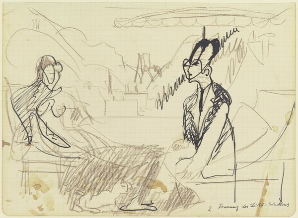 Curator: Let's immerse ourselves in Ernst Ludwig Kirchner's 1912 sketch, "Women and Sculptures on the Beach". The nervous energy in those lines is just palpable. Editor: It's just a sketch, an ink drawing, really, but even so I feel a sense of unease… like I'm peering at something intimate and maybe even forbidden. What’s your take on it? Curator: Ah, "forbidden"... Indeed! Kirchner was a master of capturing the raw, unfiltered emotions of the modern world. See how the figures seem almost distorted, their bodies elongated and angular? It is very deliberate, not merely some artistic happenstance, this "primitivism." And how do the sculptures factor into this tableau? Does it feel more to you as though these are artworks…or more a type of commentary? Editor: Hmm... I see what you mean about the distortion, how he uses those stark lines and sharp angles. To me, it’s almost as if he is using the sculptures to hold a mirror up to the women, as if the "sculptures" reflect or accentuate their features. Curator: Precisely! He is after something deep, something visceral in its impact. This is Kirchner at his most revealing, capturing not just what is seen, but what is felt. How does that feel to you now, now that you can start seeing the felt presence? Editor: Now I feel the disquiet, almost an expressionist nightmare unfolding right on the beach. Curator: And that, my friend, is the power of Kirchner! Editor: That was illuminating! I'm seeing way more than just some squiggles on a page now. Curator: It just goes to show, art, especially in a good sketch, often says more with what is unsaid.