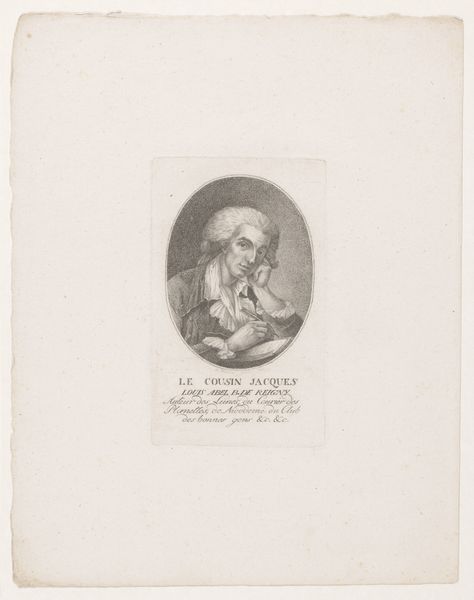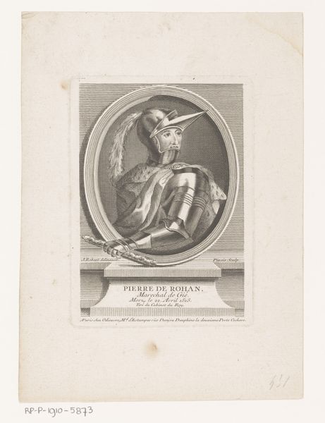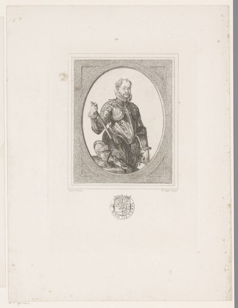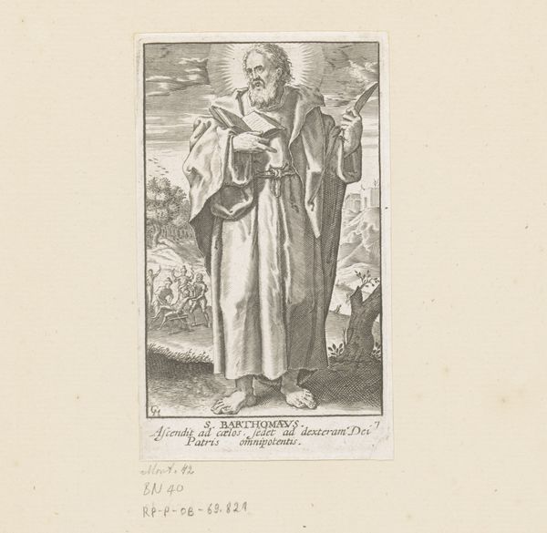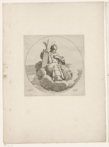 Curator: Here we have a print titled "Heilige Jakobus de Meerdere," or Saint James the Greater, created in 1646 by Simon Guillain the Younger. It’s a baroque-style engraving. What's your take on this piece? Editor: Well, my first thought is that he looks surprisingly chill for a saint sitting on a cloud. There's a definite sense of peace, maybe even contentment. Though I can't help wondering if cloud seating is as comfy as it looks. Curator: Cloud iconography of course implies holiness and transcendence. But James, traditionally seen as a robust and active Apostle, is here quite static, almost contemplative. The artist invites us to reflect on faith, the peace that passes understanding. He's holding his staff and book which represents pilgrimage. Editor: It's funny you mention the staff. He looks so grounded despite the clouds, and it’s echoed in his firm grasp of the staff – really reinforces this feeling of being present in a spiritual state. The composition feels very self-contained. It also is an interesting contrast: all that heavenly symbolism packaged in such an earthly, almost casual pose. Curator: Yes, it is a beautiful merging of heavenly and earthly motifs! Guillain seems to use the visual language of baroque drama in this piece, especially in his use of line, but turns it inwards, toward this state of tranquility. There's that circle framing James, the circular halo above him – reinforcing wholeness, a state of divine grace. Editor: It’s all surprisingly low key, in a good way. So often, religious art goes for grandeur, which sometimes loses me. This engraving feels so intimate. It feels real in some fundamental way. Curator: Absolutely, a study of quiet faith. And it allows us as viewers to contemplate something higher within our own quiet and stillness. It serves as a potent symbol for those searching for transcendence within everyday life. Editor: It truly is a beautifully meditative work; thanks for those perspectives. It definitely shifted my initial interpretation. Curator: My pleasure; hopefully our listeners find it enlightening, too.