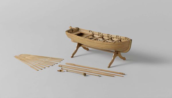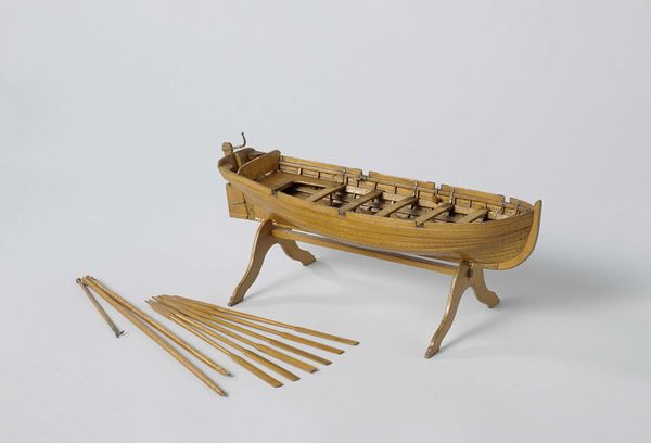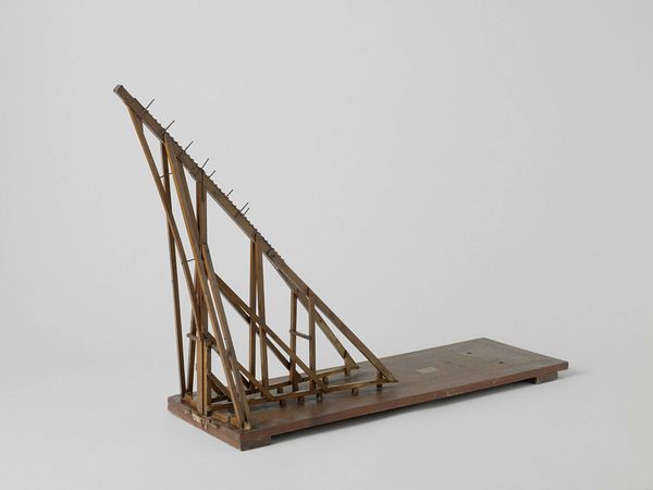 Curator: At first glance, I see such precision. This piece, “Two Models of Diagonal Framing,” dating to about 1822 and crafted by an anonymous artist, presents two nearly identical, geometric wood sculptures. Editor: My first impression is of fragility and tension. It looks as though one good push could send it all tumbling like dominoes. But also like scaffolding. Curator: It is striking how such an early work resonates with what we consider modernist sensibility. It has to do with an embrace of linearity and the way the artist treats geometrical form, a precursor, perhaps, to the later abstractions. Editor: Absolutely. Given that this model was crafted in the early 19th century, it’s worth asking about the purpose behind this piece, its role within broader social structures. My intuition sees both beauty and the rigid hand of design imposed upon organic forms. Curator: Well, let's think of diagonal lines. They don't conform to simple horizontal and vertical binaries. They convey motion, instability, something dynamic, really. Are they models of power? Editor: Or the denial of power! The wooden structures, rendered so precisely, bring to mind the radical re-envisioning that takes place within, say, utopian communities, and consider the architecture that helps enable that space. The repetition creates an interesting rhythm and might act as an effort of cohesion. The artist must know the inherent symbolism. Curator: Perhaps in the joining and repetition we find, encoded, a longing for progress and an almost desperate sense of control, the way we manage our lives or want to. There is a yearning here, don't you think? Editor: Definitely. It makes me wonder if the anonymity itself becomes a commentary on how we ascribe the very nature of control and design. How power rests in the concept itself more than with an individual? It is so relevant, really. Curator: Thinking about the artist choosing diagonal framing reminds me of our current framing. How does framing determine thought? Does this piece, then, serve as an ancestor to modern abstract works, that question of form as function? Editor: The exercise that is design asks us if there’s an inherent tension in imposing new order that may simply recycle prior forms and frameworks, even if unconsciously. I like how this object provokes so many related questions. Curator: I agree. We're able to witness form becoming both the function and the concept here. The work stays open while remaining contained.