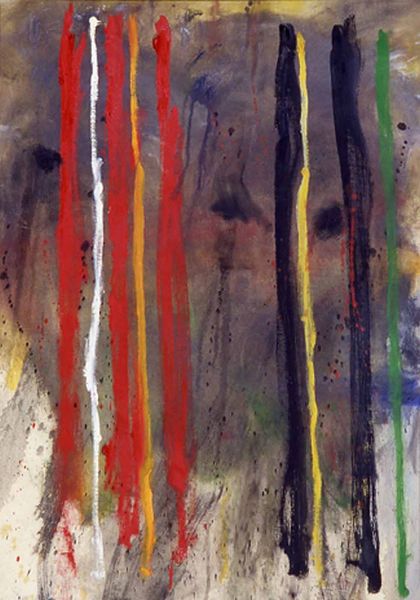 Norman Bluhm made this painting, Gronk!, using oil on canvas, and what strikes me is how alive the painting is. The colours, although a little muted, vibrate against the white ground, which is not really white at all but broken up with tiny strokes and flicks of colour. I like the way Bluhm lets the paint run. Look at the lower right, where the paint splatters and drips like dark tears. It’s really physical and gestural, like he’s wrestling with something. The big black strokes almost look like they’re framing or containing something, but what? His work reminds me of Joan Mitchell, another abstract expressionist who wasn’t afraid to get messy and emotional. Art is, after all, an ongoing conversation, a place of ambiguity where fixed meanings dissolve.