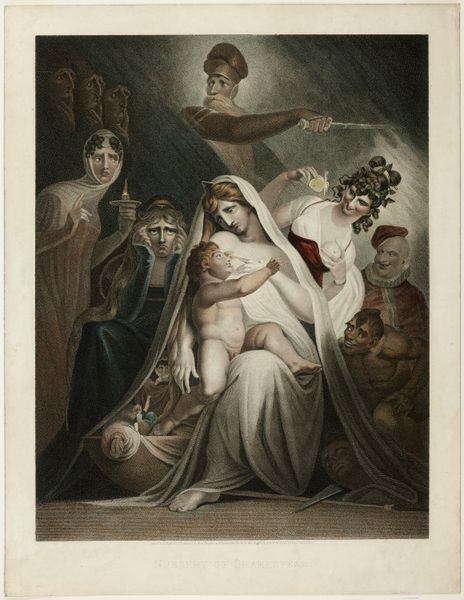 Curator: There’s an ethereal quality to this work; a watercolor by William Blake titled "The Presentation in the Temple ('Simeon was not to See Death before he had Seen the Christ')". It's currently held at the Harvard Art Museums. Editor: Yes, an almost ghostly quality! The figures seem to glow from within. It feels like a vision, a sacred moment caught in fragile light. Curator: Absolutely. Blake was deeply invested in symbolism, wasn’t he? Notice how Simeon, holding the Christ child, becomes a pillar of radiant light. His beard flows into the child almost merging them. Editor: It speaks to the institutional role of religious imagery and how power is visually transferred through generations. The composition itself reinforces the power dynamic. Curator: Precisely, and the way the others are arranged around them emphasizes the momentous nature of the event, they are almost consumed by a cultural memory, an eternal narrative. Editor: Blake really understood how to make paint and paper communicate such complex layers of meaning. It is a powerful statement. Curator: He does, doesn’t he? It's a reminder of the lasting impact art can have. Editor: Indeed, a timeless image that invites contemplation.