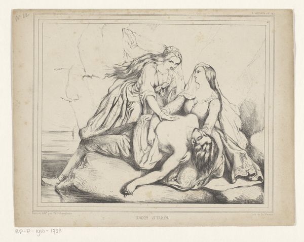 Curator: This print, "Twee naakte figuren met elkaar in strijd," or "Two Naked Figures Fighting," by Henri de Groux, produced sometime between 1877 and 1930, certainly commands attention with its raw energy. What are your initial thoughts? Editor: The dynamism is striking. It looks like some kind of struggle rendered in intaglio and etching—I can practically feel the tension and weight of that body on top. What process was involved to produce this image? Curator: Well, de Groux was known for his Symbolist leanings, and this work really exemplifies that. The use of the nude form here immediately connects us to art historical traditions, of course, but I see in it an allegory for power, perhaps male aggression and domination within broader sociopolitical struggles. Editor: You see the theme of domination through that theoretical lens, while I look at the labor required to execute this very image; consider the acid baths for etching, and the physical tools used for marking the plate, allowing de Groux to probe and incise that fierce dynamism you described. There’s a material tension as much as a thematic one, isn’t there? Curator: Indeed. And even the ambiguous date range—spanning several decades—raises questions about the context in which this conflict might have been relevant. Is it commenting on class warfare? Or a broader, perhaps personal, statement about human brutality? It could even speak to our understanding of masculine toxicity, if you consider gender as a socially-constructed and enacted power dynamic. Editor: Given its visual links to much earlier traditions in printmaking, what's fascinating here is the potential tension between those classical forms and a much more modern mode of production, making images available and affordable, to some degree, at scale. It underscores, to me, how an image travels and circulates—carrying that struggle—even today. Curator: Absolutely. Considering all the elements, the tension between the forms and what it suggests, I believe it allows us to investigate violence through visual language. Editor: Right. From process to circulation, these images give an artifact and voice to how social meaning can persist over decades through artistic materials.