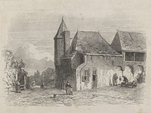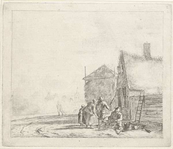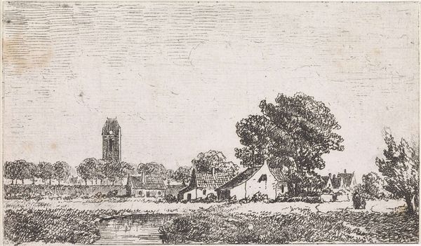 Curator: This is "Dorpsgezicht met kerktoren," or "Village View with Church Tower," an etching by Jan Gerard Smits, created in 1873. Editor: It's so delicate! The light feels captured by the etched lines; it has a melancholic stillness despite the windy tree on the left. You can almost feel the cold of the Northern Renaissance masters influencing the realism. Curator: It really encapsulates a specific kind of Dutch village archetype. Notice how the towering church acts not just as a geographic marker but a clear visual and symbolic anchor to the whole community. What does the spire evoke for you? Editor: The fact that the church and other buildings share equal weight indicates a strong, classless society, while that steeple has also, undoubtedly, been crafted by many unseen hands across generations—a tangible display of social effort through the making of material things. I wonder, what kind of presses were available for such detailed work? And how did it influence its popularity and spread amongst local society? Curator: The cultural resonance surely relies on both access and symbolic centrality. You are so right that one cannot overlook the socio-economic implications related to printmaking: its relative ease of dissemination is one of its most distinguishing qualities, and it could reach people unable to afford paintings at that time, making potent messages far more accessible. And with such potent symbolism of the Church as a symbol of refuge and communal faith. Editor: Right. I find myself appreciating more the interplay of visibility and craft, and understanding how it mirrors and strengthens existing cultural belief and socio-economic conditions. A testament to art production entwined with broader community experience. Curator: Yes, and its effect then lingers, as that scene continues to hold echoes of village identity for us, even today.