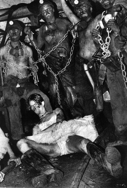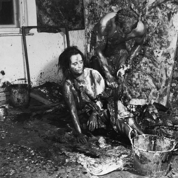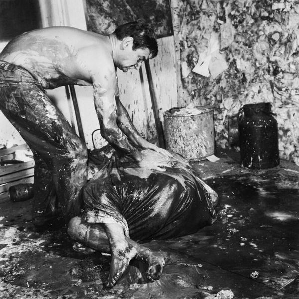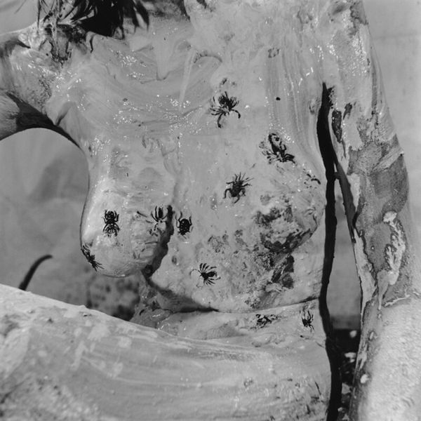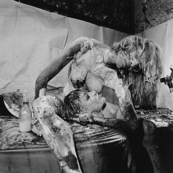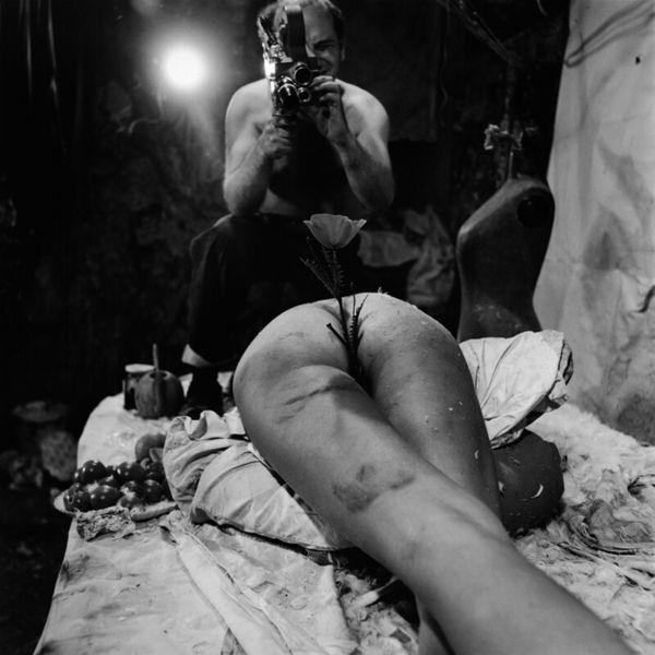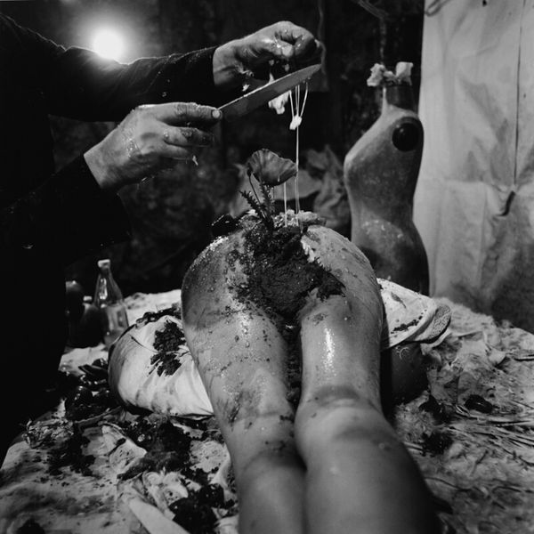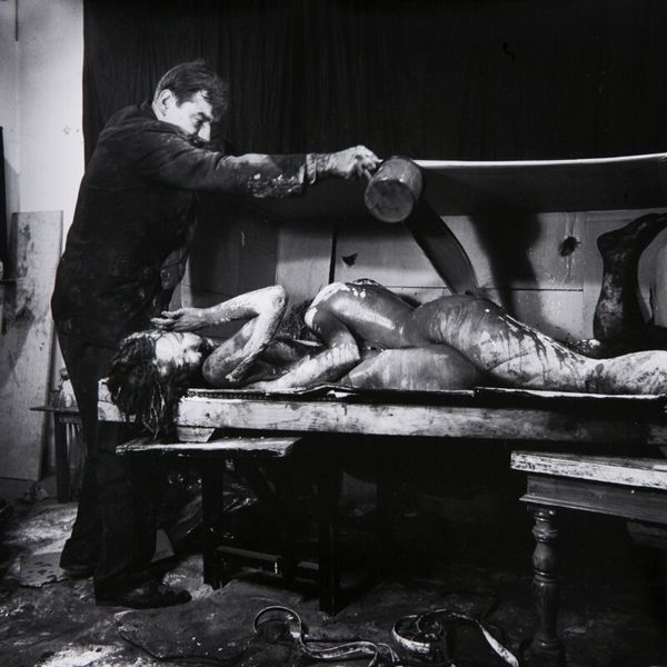 Curator: This work, titled "Mama and Papa 9," was created in 1964 by Otto Muehl, a prominent figure in Viennese Actionism. The photograph documents one of his infamous performances. Editor: Whoa. Okay, immediately, it's confrontational, visceral... that high-contrast monochrome just amplifies the rawness. It feels oppressive, almost claustrophobic. Curator: The photograph captures a key element of Muehl’s performances: the exploration of the body as both subject and object, pushing against societal norms of the time through extreme performative acts. Notice how the monochrome palette directs our gaze solely to form and texture. Editor: It’s... deeply unsettling. There’s this sense of vulnerability juxtaposed with aggressive imposition. The prone figure is literally and figuratively burdened. The textured materiality calls forth ideas around bodily limits... where does artifice begin, and self end? Curator: Indeed. Muehl often used tactile substances—like mud and blood—to break down barriers between performer and audience, between the artistic representation and corporeal reality. Here, the act of covering and obscuring invites analysis in relation to societal pressures and control. Editor: Right, it's all about transgression. Like a ritual sacrifice enacted in a B-movie. This aesthetic discomfort is not accidental, it's intended to jolt you awake. It's meant to trigger that visceral gut reaction you can’t ignore. Curator: Moreover, considering the piece within the context of Viennese Actionism clarifies Muehl's agenda to provoke a response and explore themes around sexual repression, bourgeois hypocrisy, and the deconstruction of conventional social orders. Editor: Absolutely, art as a kind of shock therapy. It is fascinating to see how it operates using basic structural elements—contrast, texture, the stark human form—to get right under your skin. Makes you wonder if things are really much different today, beneath all the filters and polish. Curator: A sobering reflection. Muehl leaves us to confront discomfort not for its own sake, but for an honesty often absent in mainstream visual narratives.
