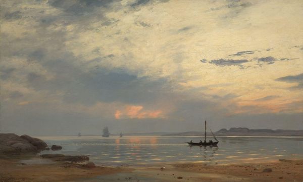 Curator: Oh, isn’t that serene? A lone boat sits on the shore as the pale sun bleeds over the still water. Editor: Yes, a liminal atmosphere hangs about Vilhelm Kyhn's watercolor and paper sketch, "The Coast at Frederiksund." Painted in 1849, it captures the Danish coastline with delicate restraint. Curator: Restraint is the word. It feels… hesitant, almost melancholic. Is that the Romanticism coming through, do you think? The muted palette really adds to the somber mood. Editor: Without a doubt, the Romantic leanings are apparent, yes. Note the structural components though—how the artist uses a strong horizontal to divide the canvas into thirds. The boat creates a diagonal which your eye then uses as a conduit between the water and the heavy, vaporous sky. Semiotically, the color drain and dissolution of objects implies absence; what's present isn’t quite there, you could say. Curator: Absolutely, there’s an elusive quality to it, almost as if you could step right through it. Speaking of stepping, the location itself, Frederiksund—it has this light of a certain kind. Perhaps Kyhn tried to get at that. The very essence of the location. It feels like he wanted to capture a feeling, a memory. Editor: "Capture" is apt, I'd say. Kyhn uses broad washes of watercolor to capture the essence of light on the water. Observe how his technique contrasts, however; precise draftsmanship with soft brushwork. In doing so, this emphasizes the transition from the transient effects of light to the more solid form of the boat. It is a dichotomy of what disappears, of that which abides. Curator: Beautifully said. I think it’s precisely that contrast which gives the work its enduring quality. One can sense him seeking the solidity of an aesthetic he was clearly already moving beyond. Editor: Indeed. Through a language of spatial planes and veiled coloration, it opens out to us, if we open to it.