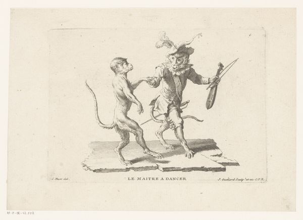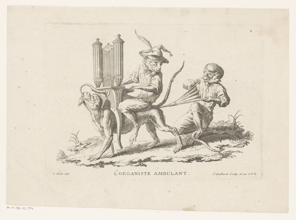 This print, "Verkoper van kruidendrank" is by Jean Baptiste Guélard. It uses the intaglio printmaking technique of etching, which is a chemical process involving acid, to create fine, detailed lines. The etching process allowed Guélard to create the image of an anthropomorphic monkey selling herbal drinks, along with a canine companion and another monkey carrying wares on its back. The process emphasizes the hierarchical division of labor between the monkeys. The crisp lines of the etching highlight the textures of fur and the intricacies of clothing, elevating what might otherwise be dismissed as mere craft. Etching has a rich history, blending technical skill with artistic expression, and challenging traditional notions of art by bringing together craft and social commentary. In this print the artist subtly comments on labor, class, and consumption. By recognizing the artistry in processes like etching, we expand our understanding of artistic expression, blurring the lines between "high art" and craft.