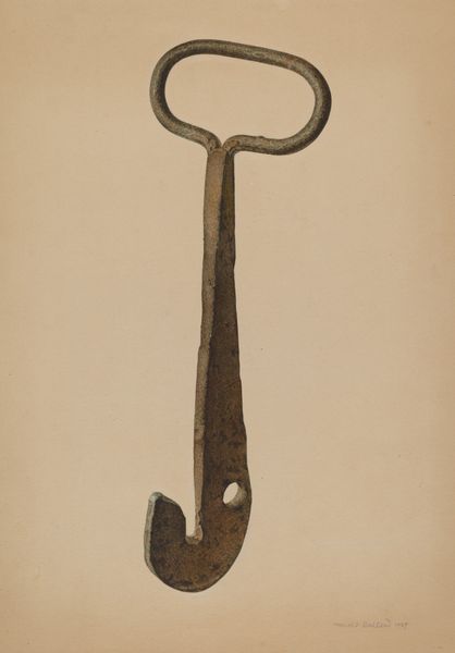 Editor: Here we have Geoffrey Holt's "Latch," created sometime between 1935 and 1942, using watercolor and drawing techniques. It's a peculiar piece. So simple, but also makes you wonder about functionality. How do you interpret this work? Curator: That’s an excellent question! While seemingly mundane, this realistic depiction of a latch tells a more significant story. Think about the 1930s and 40s, the time of its creation. What do you associate with that era socially and economically? Editor: The Great Depression and the rise of industrialization come to mind. Curator: Exactly! Consider the socio-economic landscape. Holt's decision to portray such a commonplace object elevates the everyday, turning it into a subject worthy of artistic attention. What could that suggest about art’s function during this time? Editor: Perhaps it’s about finding beauty in the ordinary or commenting on the functionality that was necessary? The latch is also sort of old fashioned, and it might point to simpler times. Curator: Precisely! The medium, watercolor, further softens what could be cold metal. Also consider where an image like this may have circulated. Was it for public display? To encourage the celebration of simpler times or a tool needed by everyday people, for farms perhaps? Editor: I didn't even consider the ways it connects with economic changes! It makes me look at "Latch" in a new way, considering how it connects to history. Curator: These glimpses of the past enrich our experience with art!