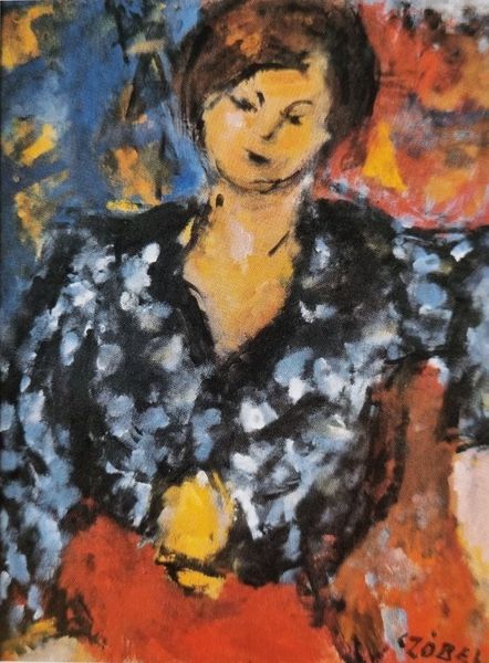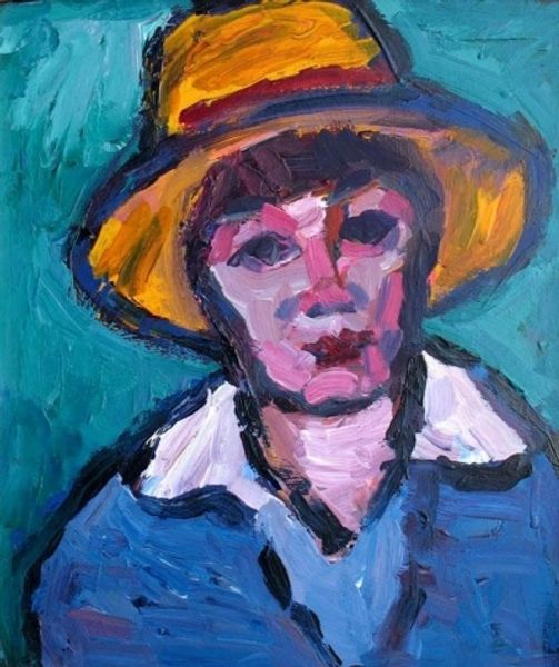 Curator: Bela Czobel's "Self-Portrait," created in 1974 using oil paint, provides a rather intense view of the artist in his later years. Editor: It’s certainly vivid. I'm struck by the almost frantic application of paint, particularly around the face. It conveys a great deal of emotional energy. Curator: Absolutely. The crude brushstrokes are quite deliberate, I think. Observe how Czobel uses contrasting colours – jarring yellows against patches of vibrant green and crimson – to create a sense of unease. It rejects traditional portrait conventions. Editor: It screams material presence. You can practically feel the thickness of the oil, see the individual strokes layering upon each other. What strikes me is the almost sculptural quality he coaxes from something so typically considered flat. One can almost feel the physicality and exertion needed in order to coax the final result, it really shows a great deal about his technique as well. Curator: Indeed. It departs significantly from more polished or classically-influenced self-portraits, doesn't it? Think about the function of the black beret – it seems to ground the portrait formally, even while contributing to the artist's chosen identity. Semiotically, it anchors the painting to ideas of profession and status. Editor: And beyond status, doesn't the almost childlike rawness, of both its materials and color, reveal the artist playing with a particular part of his own material and physical history? The visible means by which Czobel constructed this work suggest less about presentation, and instead, about the complex conditions of being a working artist in the studio itself. Curator: I agree. It’s interesting to consider that level of intimacy. By avoiding too much conventional ‘beauty,’ he achieves a much rawer depiction of lived experience. Editor: Exactly. Considering the ways paint accumulates on the surface opens pathways into understanding what this artistic practice meant for Czobel himself. Curator: It becomes less about strict resemblance and more about what portraiture can do and mean in its more fundamental and material nature. A fantastic, complex statement, wouldn't you say? Editor: It certainly encourages reflection on what can be read into the gestures made during an artistic act. Very provoking indeed.