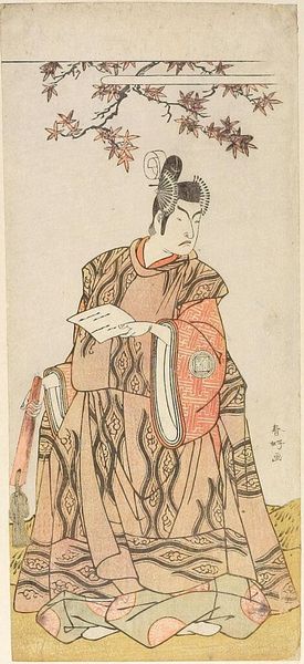 Curator: This is a print by Torii Kiyomitsu, who lived from 1735 to 1785. It depicts the actor Segawa Kikunojo playing the role of Roko. Editor: The delicate lines give it such a wistful, almost ethereal quality, like a memory fading at the edges. Curator: Indeed. Notice how the artist used a single, unbroken line to create the figure's outline, emphasizing the actor's graceful pose and the flow of the kimono. Editor: The floral patterns on the kimono are so intricate. It's like a garden is blooming across the fabric. And then there's the text – beautiful calligraphy that feels like whispers. Curator: The text is an integral part of the composition. It gives context to the image while also adding to its visual appeal. Kiyomitsu expertly balanced the figure with the calligraphic elements. Editor: It's as if the words are floating around the actor, telling her story while she stands there, poised and elegant. A beautiful piece. Curator: Yes, it's a delicate reminder of the enduring power of art to capture a moment, an emotion, a fleeting gesture.