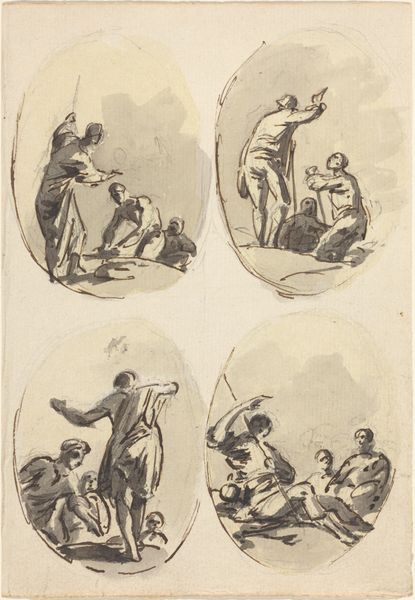 Editor: This drawing, "Design for Three Panels for a Library," was created between 1745 and 1785 by Giovanni Battista Cipriani. It's rendered in pencil, and gives off a sort of light, airy feeling with all these classical figures floating on what appear to be clouds. I’m curious, what stands out to you in this piece? Curator: The means of production for something like this—a preparatory drawing—reveals a lot about the hierarchies within art and design of the period. Pencil drawings like this were, in some ways, a commodity, outsourced and produced efficiently in the studio for later, more ‘finished’ and ‘important’ works. It raises the question, doesn’t it: where does the value truly lie? Editor: That’s a fascinating point. So, even though Cipriani designed these panels, assistants or other hands may have actually executed aspects of it? Curator: Precisely. And think about the materials themselves—the pencil, the paper. Relatively inexpensive, mass-produced items enabling this system of artistic labor. The drawing is meant to guide the making of the actual panel. How does the intended final product influence the approach Cipriani took to the design, and the function of his drawing as a blueprint? Editor: I see, the final artwork is completely reliant on the value and commodification of labor and materials during the artistic process, to reach its goal. And looking at the detailed measurements noted, it seems very production-focused. Curator: Exactly. And that production reflects the social context - a burgeoning market for classically-inspired decoration aimed at an increasingly literate and wealthy elite. Consumption driving the engine of artistic creation. Editor: Wow, I never considered all those angles! Thinking about the labor and market really does change how I see this piece. Curator: It brings new richness, doesn’t it?