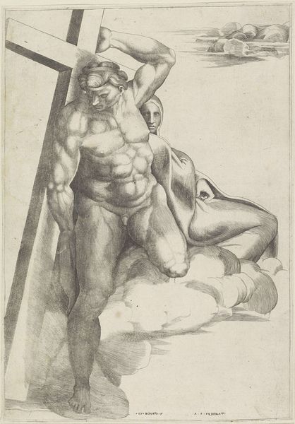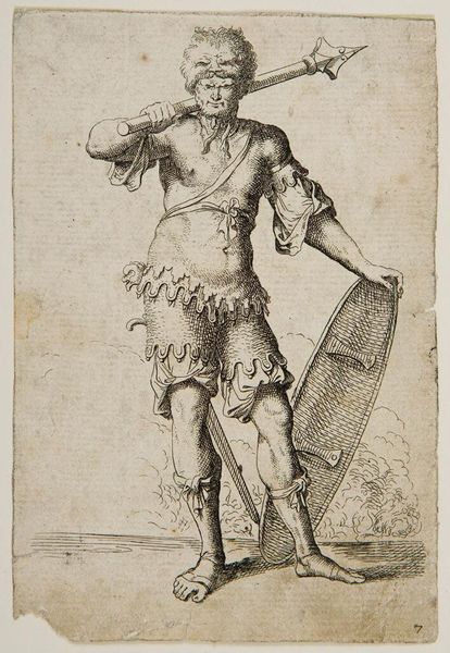 Curator: This is "Mucius Scaevola," an engraving created around 1602 by Lucas van Haelwech. Editor: My first impression is one of intense stoicism and dramatic tension. The figure’s stance and the sharp lines of the engraving really convey a sense of conflict, both internal and external. Curator: Absolutely. Van Haelwech masterfully uses line to create a sense of depth and volume. Note the cross-hatching in the musculature and the careful attention to detail in the textures of the fabrics and flesh. These create an assertive visual rhetoric. Editor: Speaking of detail, observe how this depiction amplifies ideals of masculinity. The artist seems focused on themes of heroism but in an almost hyper-theatrical, slightly troubling way when we consider historical realities surrounding displays of power and the violence enacted by male leaders. Curator: Indeed. The composition further enhances this, with the figure dominating the foreground, towering over a landscape filled with what appears to be both a city and figures that remind me of a Greek symposium or bath scene. This placement really emphasizes his authority, no? Editor: To me, the tiny figures behind the large depiction suggest a contrast between individual acts of defiance—such as Mucius’ legendary display of courage when he thrust his hand into the fire—and the complexities of broader social and political structures of the time. Curator: You've offered a persuasive account of what this engraving means from a historical point of view. Looking simply at the technical proficiency involved, I cannot help but stand amazed at van Haelwech’s masterful control over line and texture to convey such a strong emotional narrative. Editor: Ultimately, this is one image open for endless discussions and subject to re-evaluation—as relevant today as it would have been at the beginning of the 17th century. Curator: Agreed, a brilliant encapsulation of that particular historical narrative as it touches the broader scope of masculine fortitude.