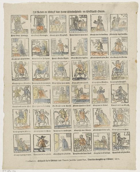 Curator: This is "De Verkeerde Waereld," or "The Topsy-Turvy World," an engraving dating sometime between 1761 and 1804, now held at the Rijksmuseum. Editor: It strikes me immediately as a critique of societal norms. There’s something playfully subversive about it. Curator: Exactly. These little vignettes each present a world turned upside down. For instance, one scene shows a fish flying and a bird swimming—a disruption of the natural order. Editor: And that reversal carries significant symbolic weight. We're seeing a dismantling of expected hierarchies and power structures. This was a time of Enlightenment questioning. How might this speak to revolutionary sentiments brewing at the time? Curator: Perhaps the artist sought to visually represent the burgeoning societal shift. It's presented through easily understandable imagery, allowing widespread interpretation and resonance. We can see "the world upside down" appears time and time again through visual language, going as far back as ancient Egypt, and persisting through the medieval era. Editor: That visual language creates accessibility. Think about the symbols themselves—the ox in place of the man, for instance, subverts social status. We’re seeing a commentary on social mobility or perhaps the lack thereof. It prompts us to think critically about what is deemed "natural" or "right." Curator: It could also function as a memento mori. Consider the visual weight of time as it decays into nothingness, and consider then the chaos or absurdity that follows—life turned on its head. By pointing out what is "wrong" it perhaps reflects on values of correctness at the time. Editor: I see that too, definitely. By calling out these absurdities, isn't the artist subtly encouraging us to imagine a world built on different principles? Principles of perhaps...equality and justice? Curator: It’s a visual riddle wrapped in societal reflection, provoking discourse then as now. Editor: A call for change cleverly disguised as whimsical entertainment, wouldn’t you agree? I find it endlessly fascinating.