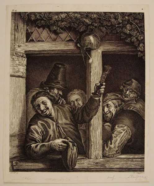 Editor: This is Rembrandt van Rijn’s etching, "Joseph's Coat Brought to Jacob." The scene is so emotionally charged, and Jacob's grief is palpable. What strikes you most about the imagery in this piece? Curator: Note how Rembrandt uses the visual language of light and shadow to amplify the emotional weight. The tattered coat, a symbol of lost innocence and betrayal, becomes a potent icon of familial trauma. What does the positioning of the figures suggest to you? Editor: It's like each person is trapped in their own grief. I had not considered the coat as such an important symbol until now. Curator: Precisely. By depicting this biblical story through these symbols, Rembrandt taps into universal themes of loss and deception that echo through cultural memory. Editor: I see now how Rembrandt used potent iconography to deepen the narrative's emotional impact. Curator: Indeed, the visual symbols resonate profoundly across time, embodying enduring psychological truths.