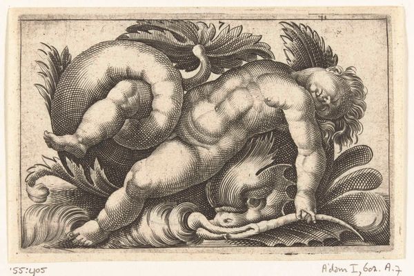 Adam Fuchs created this small etching of a putto riding a sea monster. The imagery is rooted in the artistic and cultural context of late 16th-century Europe. The chubby winged child, or putto, and sea monster were popular motifs during the Renaissance, often symbolizing themes of love, beauty, and the power of nature. These images were frequently deployed in decorative prints intended for use by artisans. The composition creates a sense of dynamic movement despite the static medium of print. The putto, almost wrestling with the sea monster, infuses a playful, energetic quality into the work. Consider how classical mythology and Renaissance humanism are interwoven here; the putto signifies innocence and beauty, set against the wild, untamed sea monster. The image invites us to consider the relationships between power and vulnerability, and intellect and raw instinct.