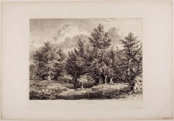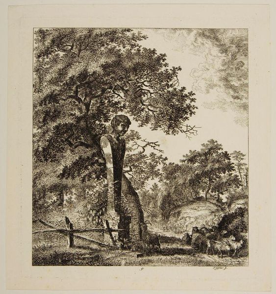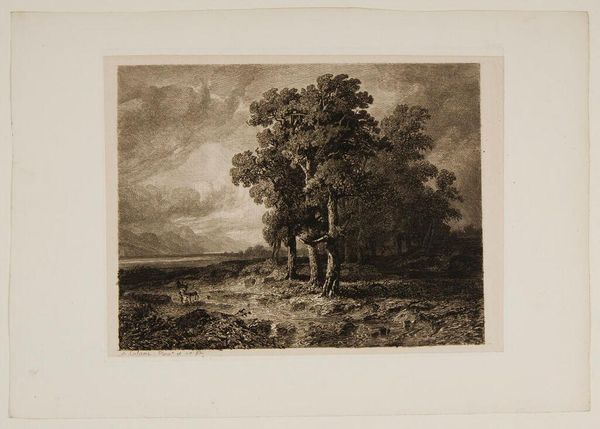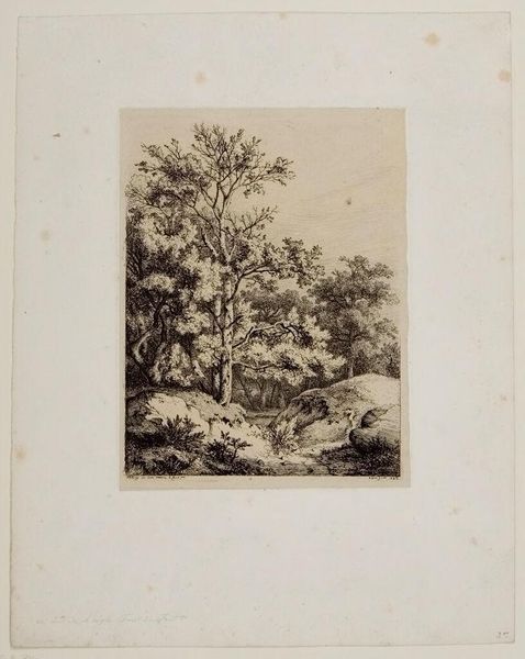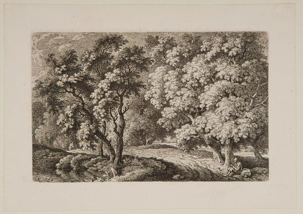 Curator: Let's turn our attention to Alexandre Calame’s print, “Two Peasants on a Forested Lakeshore,” currently held at the Harvard Art Museums. Editor: It's immediately striking how the artist uses light and shadow to create depth. The density of the foliage in the foreground really contrasts with the misty distance. Curator: Indeed, the textural variations achieved through the etching process are quite remarkable. Note how the artist manipulates the etched lines to define form and space. Editor: And the subject! It's all about landscape, and the humble figures become part of the working scenery. I wonder what kind of labor they're performing, or if they are just walking through... Curator: The composition invites contemplation, doesn't it? Calame structures the scene to emphasize the formal balance between the natural and the human elements. Editor: It certainly highlights the relationship between people and the natural resources around them. Makes you consider how people affect a landscape. Curator: A point well taken, emphasizing the interconnectedness within the pictorial space. Editor: Absolutely, it all comes back to what's gained or taken in the production of the piece.