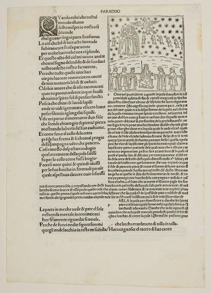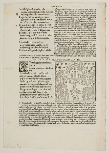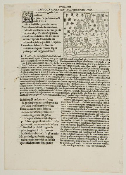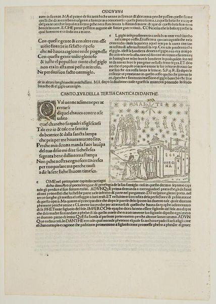 Curator: This page, from an anonymous publication, features an illustration titled "Canto XXVI. The Eighth Sphere: The Fixed Stars; Saint James; The Examination of Love (Caritas); The Expulsion of Adam and Eve." Editor: Wow, it's bursting with activity! It almost feels crowded, but in a way that suggests the vastness of the cosmos and humanity’s place within it. Curator: The image depicts several scenes simultaneously. The upper portion shows celestial figures amidst stars, while below, we see Adam and Eve, first in paradise, then being expelled. Editor: I see that contrast. The top feels ethereal, almost weightless with those floating figures among the stars. And then, below, there's the gravity of Adam and Eve’s expulsion, their shame palpable even in this small, stylized form. Curator: Exactly. It juxtaposes divine order with human fallibility, a central theme within the literary work the image accompanies. The stars represent divine knowledge, and the story of Adam and Eve symbolizes the loss of innocence and the consequences of disobedience. Editor: It's fascinating how much narrative and symbolism they managed to compress into a single frame. It really pulls you into a meditation on knowledge, choice, and our relationship to the divine. Curator: Precisely, and that's the enduring power of images—to condense complex ideas into accessible, evocative forms. Editor: It really gives you a lot to ponder.
