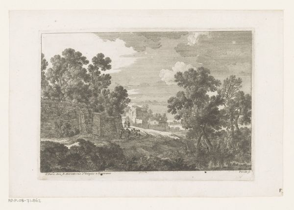 Jean Louis Demarne made this small landscape with fence and shepherds with cattle as an etching. The meticulous hatching and cross-hatching generate a wide range of tonal values from light to dark, creating a sense of depth and volume across the composition. The landscape is divided into distinct zones. In the foreground, densely shaded areas define the rough ground and immediate surroundings. A large tree and central wooden fence anchors our view, while beyond this, the landscape opens up to reveal a sloping hill. We can observe cattle scattered across the hill, suggesting the scene extends further into the distance than the limited dimensions would imply. Consider how the fence, a rudimentary structure, functions not merely as a physical barrier but as a signifier of human intervention and control over nature. The way Demarne captures this scene highlights the formal and structural elements and encourages a reflection on humanity’s role within the pastoral setting. This prompts an ongoing visual dialogue between nature and culture.