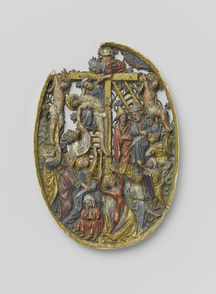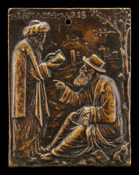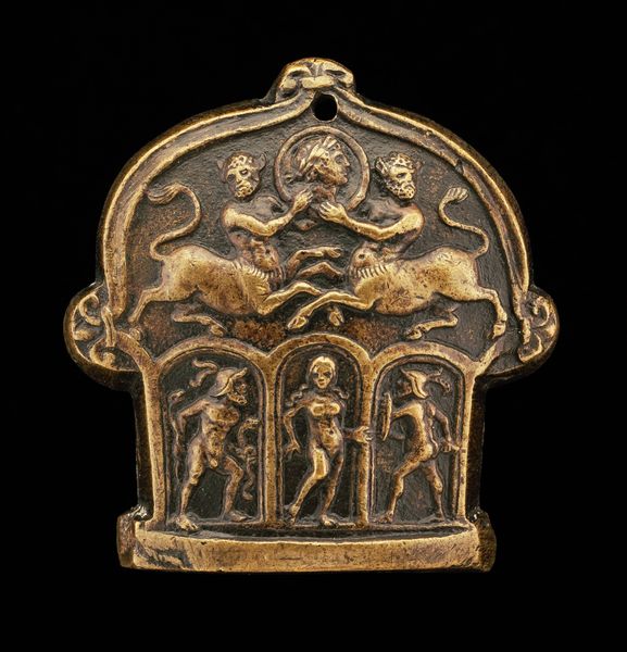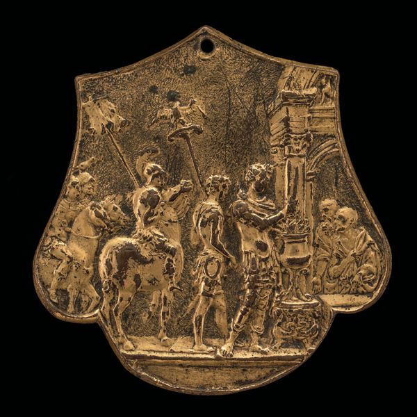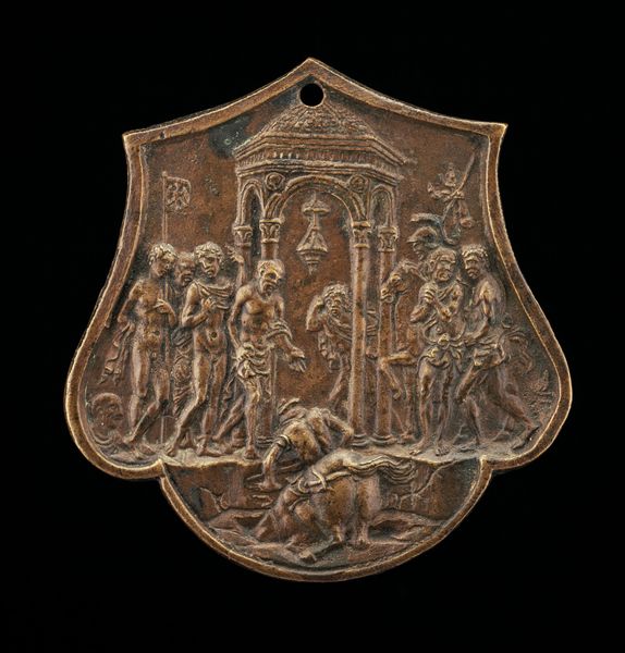 Curator: Here we have a small, intricate bronze relief, "The Nativity," dating from around the 16th century, by an anonymous artist. The scene is classic, filled with familiar figures, rendered with exquisite detail in this small format. Editor: The first thing that strikes me is its aged bronze patina, which gives it an antique feel. It's so detailed and compact that I almost need to use a magnifying glass to appreciate the expressions on the figures’ faces! There is an aura of serenity, despite the bustle of figures packed into the scene. Curator: Right, these kinds of reliefs were likely commissioned for private devotion, small enough to be held or easily transported. What I find interesting is how this work, though religious, exists within a flourishing art market of the time. Bronze casting itself was a signifier of artistic sophistication and economic status. Editor: Absolutely! The inscription itself – "Nativitas Domini" – the birth of the Lord – is iconic. But the anonymous creator adds their individual style with the subtle arrangement of light and shadow within the composition. Notice how the Holy Family is spotlit, surrounded by supportive, darker figures, almost like players on a stage. Curator: Indeed. This interplay reinforces the central role of the Nativity, highlighting a visual hierarchy, which directly correlates with the Church’s socio-political role at the time. Editor: And let's not forget the angels hovering above, the ox and the ass symbolizing the prophecy from the Book of Isaiah coming true. Each element is a well-worn symbol imbued with generations of belief, meticulously included here to spark religious reflection. Curator: Right, in studying this piece, it's compelling to observe how devotional practice found a nexus within artistic patronage and the wider, shifting cultural values of Renaissance Europe. It shows art objects held significant public and private roles. Editor: For me, I am constantly captivated by the way certain symbols have held consistent meanings across centuries. Examining "The Nativity" reminds us that narratives persist. It remains deeply connected to cultural memory and the enduring power of visual representation.