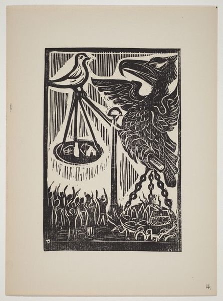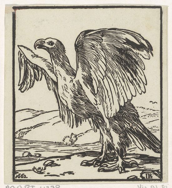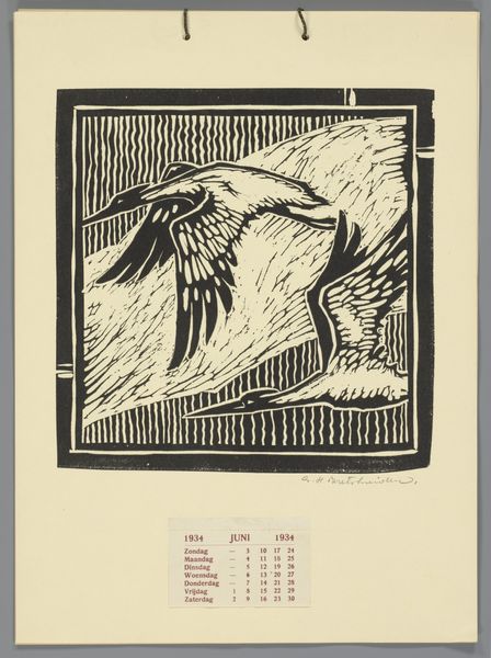 Editor: This is "Kalenderblad voor december (?) 1934 met drie roofvogels in berglandschap", a 1933 linocut print by G.H. Bretschneider. The strong contrast between the black ink and the white paper really jumps out at me, and it has such a bold, graphic quality. What do you make of the composition here? Curator: Indeed. The interplay between positive and negative space is masterful, would you agree? Notice how Bretschneider uses the linocut technique, characterized by its stark lines and flat planes, to flatten the mountainous background and draw the eye to the fore, making the contours and textures of the birds primary. Observe the subtle gradations achieved through the varying widths of the lines. Editor: So you're saying that it's less about depicting the scene realistically and more about the abstract shapes creating a dramatic effect? Curator: Precisely. The geometric shapes of the mountain and the calculated distribution of light and dark – is this not reminiscent of the stylized landscapes common in Expressionist printmaking? Think about the work’s rhythm. What visual patterns do you discern, if any? Editor: I see! The repeated curves in the birds' feathers create a rhythm. It's very stylized but it's effective in conveying a sense of the birds' presence. It feels very powerful. Curator: A keen observation! Bretschneider emphasizes inherent features like form and line rather than atmospheric effects or perspective tricks, focusing on the object rather than mimetic accuracy. Editor: This close analysis is helping me appreciate the power of this medium even more. Thanks! Curator: My pleasure! Delving deeper into the visual vocabularies will always offer something valuable in return.