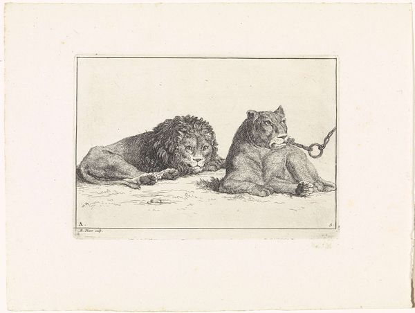 Editor: Here we have Bernard Picart's "Liggende leeuw," or "Reclining Lion," made in 1729. It's an ink drawing, almost an engraving, and it has such a relaxed, almost domestic feel to it, despite being a lion. What strikes you about it? Curator: What interests me is the accessibility of the image itself. Consider the production. It is made of humble materials like ink and paper and, through the printmaking process, this image would have been made available to a wide audience. How does the choice of materials democratize representation? Editor: Democratize representation? That’s interesting… Curator: Yes. It isn’t some oil painting, reserved for the wealthy elite. Engravings like these were much more widely distributed. We might think about the artist's intention. Was Picart trying to make the Lion, a symbol of power, more accessible to the masses by utilizing this specific material practice? Editor: That's a point I hadn't considered. So, the conscious selection of printmaking suggests a kind of subversion, perhaps even criticism, of hierarchical structures within society, no? The king of beasts made accessible to the commoner. Curator: Precisely! Think of it as challenging established notions of artistic value and questioning who gets to access certain imagery. The lion, rendered in ink, loses some of its regal aura. Does the material itself transform the cultural meaning of the lion? Editor: I see, the seemingly simple medium of ink facilitates access and prompts us to interrogate power dynamics… Something I will surely take into account. Curator: Exactly. Materiality and method intersect, producing meaning beyond mere representation.