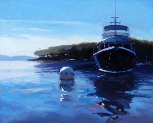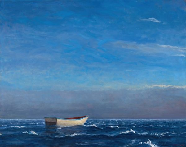 Curator: We’re looking at “Rescue Mission,” an oil painting by Mark Beck. The impasto technique gives the seascape and the single, bright-red boat an almost tactile quality. Art Historian: It's evocative, isn’t it? The first thing that strikes me is this brilliant, almost defiant, red of the boat set against the cool blues of the sea and sky. Red against blue – a powerful dichotomy, symbolically representing passion or sacrifice adrift on the sea of tranquility. Curator: Absolutely, and thinking about rescue, one wonders about agency, right? Is this a vessel awaiting its crew, perhaps ready to embark on a daring act? Or, is it a symbol of reliance, illustrating the reliance and interdependence on community to enact actual rescues? I keep wondering, whom are we rescuing, and from what? Art Historian: Or are we meant to be rescuing *it*? Abandoned vessels carry so much weight in folklore and visual language; they are allegories of human hope. Think of the Ship of Fools motif – journeys, uncertainty, existential vulnerability. I notice it is tethered by a rope; is this implying that safety is within reach? Curator: The boat feels incredibly isolated in the frame, almost as though the figure(s) inside are insignificant to the painting, perhaps a reminder that one cannot take on global struggles alone. I wonder how the artist pictures the relationship between individual action and collective progress. Art Historian: True. The artist plays on that sense of individual existence versus nature's enormity. The reflections, how the colour of the boat blazes underneath it... it makes me think of those votive candles lit with prayer. It seems such an enduring, visceral invocation. Curator: Considering the sociopolitical climate, its call to communal action and reciprocal solidarity resonates. Perhaps Beck seeks to rekindle a dedication to shared humanity. Art Historian: I can see that. It’s less a straightforward depiction, more of a meditation on faith in human endeavour. Curator: I leave with more to think about, perhaps in part because it reminds us how vulnerable our shared experiences really are. Art Historian: Yes. Art at its best allows you to see yourself from a different horizon.