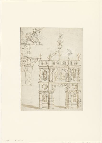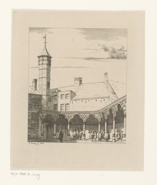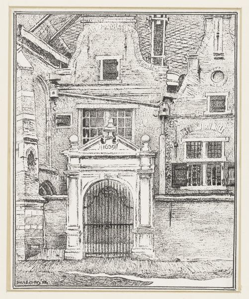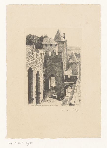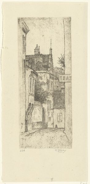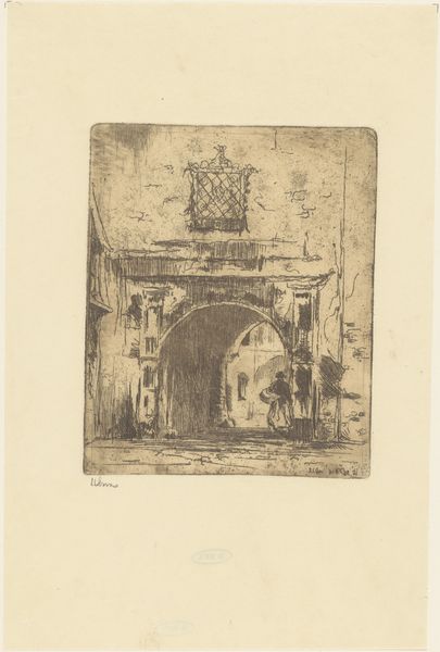 Editor: This is Willem Adrianus Grondhout's etching titled "Enkhuizen," created sometime between 1888 and 1934. It gives me a quiet, contemplative feeling, like stepping back in time. What do you see in this piece, particularly with regards to its imagery? Curator: The etching presents a gateway, an entry point, doesn’t it? The gateway is a powerful symbol in art and myth. Ask yourself, what does a gate signify? Editor: Transition? A boundary? Curator: Precisely. It marks a threshold. Is it open or closed? Locked, even? The lone figure adds to this symbolism. Where is she going? Where has she come from? This is not merely a depiction of a city; it’s about access, permission, and perhaps even prohibition. Think about what ‘Enkhuizen’ represented during its Golden Age – a centre for trade, power, and possibility. Does this image echo or question that historical narrative? Editor: That’s interesting. I hadn’t considered the gate as anything more than architectural detail, but it really does shape the whole feeling of the print. Is it inviting, or foreboding? Curator: The light and shadow, too, play a significant role in conveying emotion, no? What does the subdued palette evoke in you? Do you feel welcomed into Enkhuizen, or kept at a distance? Consider how those contrasts shape the viewer's emotional journey through the image. Editor: It’s less of a celebratory entrance and more of a pensive pause. I see that now. Thank you. Curator: Indeed. Every detail – the gate, the figure, the light – speaks to the layered cultural memory embedded within a simple cityscape. This piece invites a slow, thoughtful reading. I enjoyed reconsidering Grondhout's technique in relationship to Dutch Golden Age traditions with you.