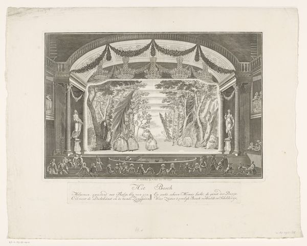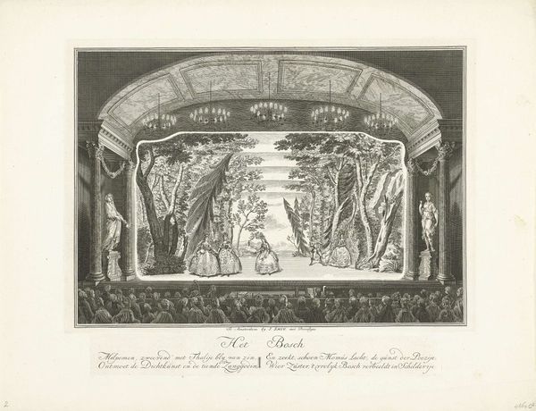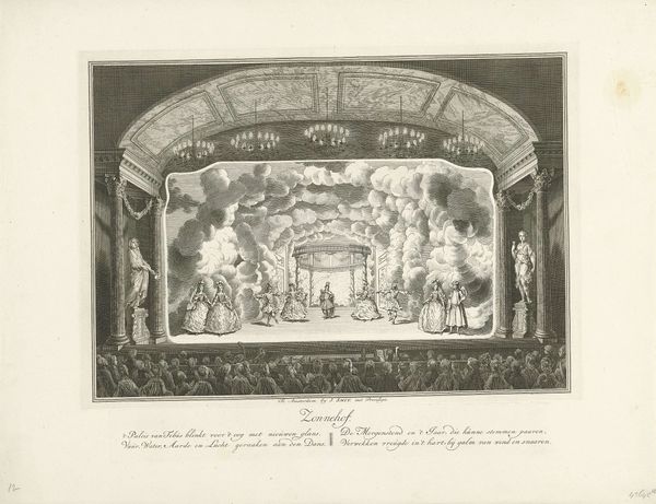 Editor: This is "Schouwburg met toneeldecor: De Hel" by Jan Punt, likely from between 1738 and 1772. It's an engraving. I'm struck by the dramatic perspective and the somewhat unsettling imagery. What kind of cultural context should I consider when looking at this? Curator: Well, this piece exists at the intersection of theater, visual arts, and social commentary. Jan Punt was documenting a stage set, and these sets weren't just decoration. "De Hel" – "Hell" – signals more than mere entertainment. How do you think the representation of Hell in a public theatre impacts its audience? Editor: I guess it depends on the audience. Was it supposed to scare people into being more religious or was it seen as simply a thrilling show? Curator: It's complex. Theatre was very public, and thus intertwined with the politics and morals of the time. Images of hell were common, and by visualizing these scenarios on stage, artists like Punt invited the public to consider the consequences of their actions and also provided some commentary. The engraver captured a slice of popular culture and the way morality was negotiated in public spaces. Think of the spectacle, the shared experience – it's a form of social control but also a space for catharsis. Notice the audience in the foreground. What do their expressions tell you? Editor: They are hard to read, honestly. It's more of a mass of faces, all pointed toward the stage. It is definitely powerful knowing they were meant to be implicated by the work. Were such politically-loaded depictions common for stage design during this period? Curator: Exactly! Stage design at this time became increasingly elaborate, competing with other art forms for visual impact and offering moral or political messaging. Editor: That really shifts how I see this. It's less about individual artistry and more about the social and political function of art. I will remember to keep socio-political forces in mind for future analyses! Curator: Precisely. The 'politics of imagery' indeed shape the public's imagination!