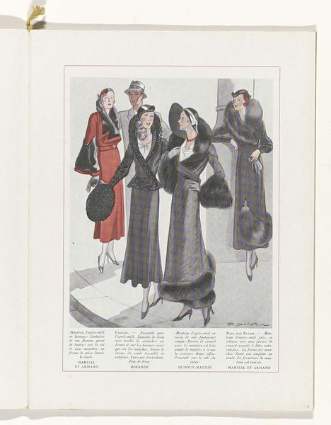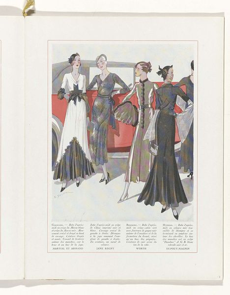 This fashion plate was made by R. Drivon in June of 1932, and what strikes me most is the delicate way it suggests form and depth. It's all about the subtle shifts in color and tone, a real masterclass in understatement. Drivon is giving us a peek into the world of 1930s fashion, but it's also showing us how much you can do with a limited palette. The colors are muted, almost melancholic, but the artist coaxes out a subtle, radiant range. Look at the way the shadows fall. The thin washes of paint create volume without harsh lines. It's like Drivon is whispering secrets about light and form. The wispy lines and soft shading feel very connected to the delicate sensibilities of artists like Manet, whose work also explored the interplay of light, fashion, and fleeting moments. Ultimately, this plate reminds us that beauty can be found in the most unassuming of places.