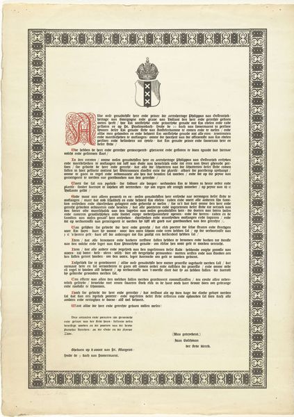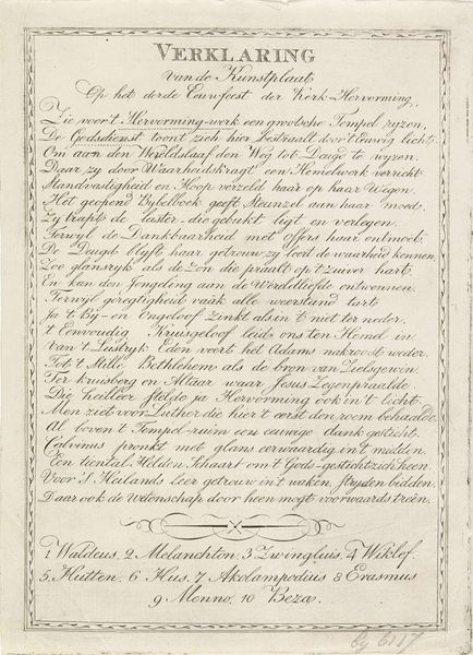 Curator: Just look at the level of detail in this piece. It’s an illustrated broadside titled "Vers bij het Alliantiefeest te Amsterdam, 1795," which roughly translates to "Verse for the Alliance Feast in Amsterdam, 1795." It's a fascinating mix of print, drawing, and typography on paper. The artwork dates back to 1795. Editor: My first impression? Overwhelming! There’s so much text crammed onto this page. It gives off a feeling of urgent political declaration… and, dare I say, a bit of visual chaos. Is it meant to be read, or admired first? Curator: Both, perhaps! It reflects the Neoclassical style of the time, with an emphasis on order and reason, even as it celebrates a period of upheaval and alliance. What might seem chaotic to us was, in its day, a carefully structured message for public consumption. Broadside were common for political movements to disseminate information. Editor: I see what you mean. The allegorical image at the top tries to bring order to the page, like a centerpiece trying to corral the commotion around it. It's all intertwined; the French and Batavian Republics becoming one, or so this artist is willing them to be. How much influence could a piece of graphic art such as this truly wield on a country’s geopolitical landscape? Curator: The French Republic heavily sponsored this unification between it and what is now the Netherlands. Consider the context. Amsterdam was in a celebratory fervor, a symbolic event marking a political alignment. This wasn't just information; it was carefully crafted propaganda to foster enthusiasm. Note the use of both French and Dutch here – the dual-language aspect emphasizes unification, even as the written test sings the praises of those very ideals. Editor: Right, so it is serving almost as a form of idealized press release. It wants to appear beautiful but exists to serve its own ends as well. Despite the overt nature of the text here, I can almost appreciate the hand-drawn border as a testament to an actual human putting in time and care. Curator: The artistry elevates the political message. A call to action disguised as, or perhaps enhanced by, artistic merit. Editor: A strange collision of propaganda, neoclassical order, and sincere hope for lasting peace… or at least the appearance of it. I feel I need to lay down after this broadside; my mind has been filled to the brim. Curator: It definitely is an intense piece. A reflection of a turbulent time captured in ink and paper, an era trying to believe in a better tomorrow.