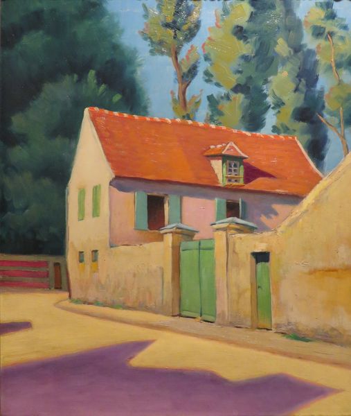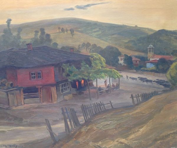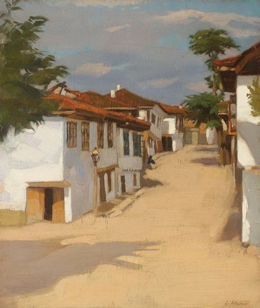 Editor: This is "Street in Turtucaia," an oil on canvas, potentially painted en plein air, by Constantin Artachino. I find the composition really intriguing, with that curving road pulling your eye through the scene. What do you see in it? Curator: The most striking aspect for me is the masterful manipulation of color and light. Observe how the artist uses short, broken brushstrokes to capture the transient effects of sunlight on the buildings and foliage. The juxtaposition of warm and cool tones creates a sense of depth and atmosphere. Notice the impasto technique, adding texture and dimension to the surface. How does the application of paint contribute to your understanding? Editor: I see what you mean, especially the way the thickness of the paint almost makes the leaves three-dimensional. The way he's built up the surface feels as important as what he's depicting. Is that something Artachino might have been consciously exploring? Curator: Absolutely. The very act of painting becomes a central theme. He is less interested in a photorealistic representation and more in capturing the sensory experience of being in that place. We might consider the painting's structure: the foreground is grounded, the middle ground curves away, leading to the background where shapes soften. How does the artist use perspective? Editor: I suppose the curve of the road guides the eye, preventing it from simply resting. Plus the brushwork itself seems to deny any static reading, any illusion of perfectly still air or solid objecthood. It's always moving, flickering with light. Curator: Precisely! So, what began as a street scene, becomes a deeper meditation on paint, perception, and pictorial structure. Editor: This was very insightful! I realize now how much I was missing by focusing solely on the subject matter. Curator: And I am always thrilled to share my enthusiasm. There is always so much to discover by simply slowing down, and closely *seeing* a piece of artwork.
