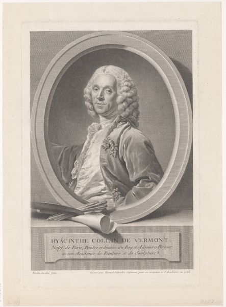 This is Nicolas de Larmessin's portrait of Guillaume Coustou, made using etching and engraving techniques sometime in the 18th century. It is interesting to consider the artistic and social structures that made this portrait possible. Larmessin, as an engraver, was part of a network deeply embedded in the court and academic circles of the time. Coustou, a sculptor for the King, is shown here not just as an individual, but as a figure of the French Royal Academy. The portrait includes signifiers of his identity, such as the tools of his trade and a sculpted head, these elements underscore Coustou's status and skill. The gaze and open posture of Coustou suggest a man confident in his position, yet there is an undeniable performativity in the image. The elaborate wig and the carefully arranged tools are visual cues of the era’s emphasis on status and artistic virtuosity. In its own way, this portrait is as much a fabrication as any of Coustou’s sculptures. It offers us a glimpse into the constructed identities of the artistic elite.