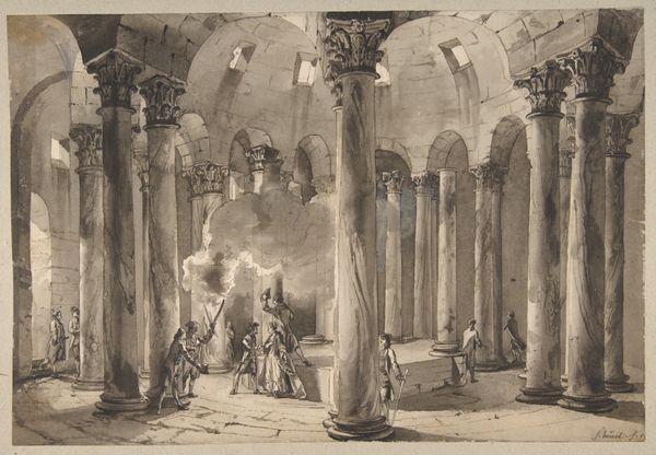 Editor: So, this is "Kloostergewelven met monniken" – or "Monastery Vaults with Monks" – made in 1844 by Hippolyte Victor Valentin Sebron. It's a drawing done with ink on paper, and there's a rather melancholic feel to it, the muted tones accentuating a sense of quiet contemplation, almost solitude. What do you see in this piece? Curator: Well, immediately my eye is drawn to the labor embedded within. Consider the production of the ink itself – the gathering of materials, the grinding, the mixing. It’s a craft-based process rendered in the service of depicting what? An imagined medieval scene. There’s a tension there, a 19th-century artist romanticizing a pre-industrial world with the very tools that industrialization was changing. Think also about the social context of monastic life; how the labour and the making becomes devotional. Editor: That's fascinating! I hadn’t considered the contrast between the artwork’s subject matter and its creation. It makes me think about how readily available these materials are today. Do you see that romanticized element as a commentary? Curator: Precisely! Sebron's choice of subject highlights the changing dynamics of labor and spiritual practice of his time. Are those monks actively producing anything beyond their prayers? This links back to how we consume images of the past, often divorced from the means and conditions that made them materially possible. Editor: So, we are left to wonder how our current means of production will be viewed by future generations? Curator: Indeed. By analyzing the material history and cultural context, we gain a deeper appreciation, not just of this drawing, but also how we ourselves create and consume in the present. Editor: I will definitely think more critically about artistic labor moving forward. Thanks!