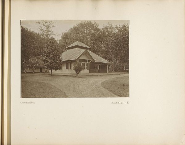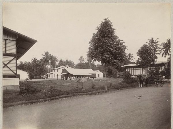 Curator: This gelatin-silver print, created by Heinrich Ernst & Co. around 1890-1900, captures a "View of a House with Garden and Tall Trees, Langkat Sumatra." It’s currently held in the Rijksmuseum. Editor: Instantly, I'm struck by a sense of colonial serenity. It's very… ordered. There's something about the stark lines of the building juxtaposed with the towering, wild trees that feels almost deliberately composed. It suggests control, but within an environment determined to stay alive! Curator: That interplay of control and nature is absolutely key. Photography during this era often served a documentary purpose, but it also conveyed power. Here, we see the architecture reflecting European styles amidst the Sumatran landscape, symbolizing colonial presence. Editor: Exactly! And I wonder how the local communities viewed these meticulously captured images. Did it register as an imposition, a kind of visual staking of claim? The very act of freezing this specific view feels...loaded. Curator: I think so. The symmetry and composition draw the viewer in but simultaneously reinforce a certain power dynamic. Landscapes, while seemingly innocent, became tools in solidifying and romanticizing colonial projects. The choice of angle, the sharpness of detail – it all contributes. Editor: It's beautiful, in a way, but that beauty is tainted by its context. Knowing it’s a gelatin-silver print, from that time... You almost sense the weight of history embedded in the chemicals on the paper. The details on that building -the veranda and trim- are so sharp that I wonder who is inside, enjoying this meticulously "landscaped" space. Curator: Right, because the question arises: for whom was this vista created? For local eyes, or for export, reinforcing narratives of exoticism and dominion for audiences back home? It certainly invites us to reflect on whose story is being told, and how, even in an image seemingly about trees and gardens. Editor: And it encourages you to dig deeper behind pretty picture! The serene appearance is just a doorway. Thank you for shining some light onto this loaded photograph.