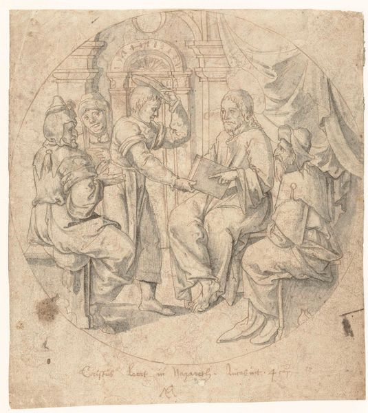 Jan de Barnsteen created this drawing, "Standing Young Man, Seated Woman and a Servant," using a red chalk technique. The composition divides our attention between the figures arranged asymmetrically in an interior space. Barnsteen’s use of hatching and varied line weights creates texture and depth. This formal arrangement invites us to consider how these lines function beyond mere representation. The figures, while detailed, are enveloped by a network of lines that seem to connect them, suggesting underlying relationships and social dynamics. The setting, though rendered with architectural details, is secondary to the interplay of figures. This reflects a shift in artistic focus towards exploring human relationships and social interactions within domestic spaces. The lines articulate not just form but also the unseen ties that bind these figures together, making the drawing a study of human connection and space.