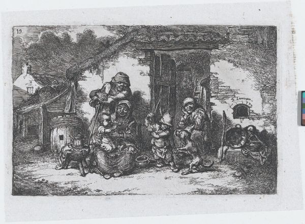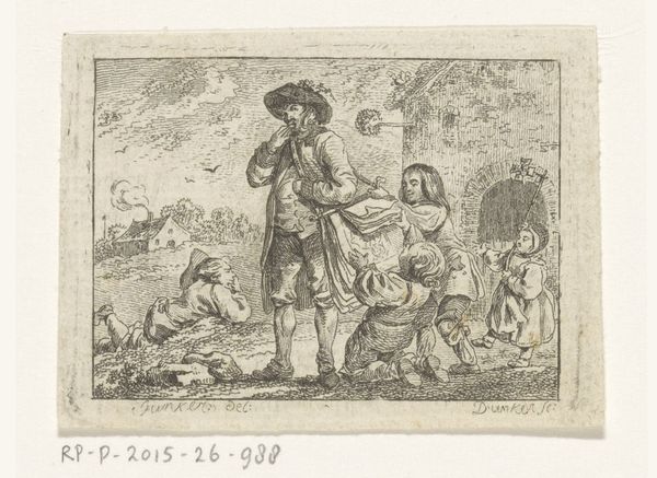 Francisco Lameyer y Berenguer made this etching, one of a series capturing the customs of the Spanish people. Here we find a group of people in the street, likely beggars, a subject as old as art itself. Observe how the central figure, a man with a hat, stands wrapped in cloth. This motif of the draped figure goes back centuries. We see it re-emerge in classical sculpture, where the folds of fabric suggest movement and life. Consider, for example, the ancient Roman sculptures of veiled figures—symbols of mourning, piety, or concealment. The fabric here is tattered, and it takes on a different meaning, suggesting vulnerability and poverty. The act of covering oneself can represent various psychological states: protection, shame, or transformation. Across cultures, we see similar gestures in religious and mythological narratives, as characters change identity or seek refuge. It is a powerful image that speaks to the human condition. The cyclical nature of poverty and the enduring need for compassion echo through time, reminding us of the timeless struggles depicted in art across the ages.